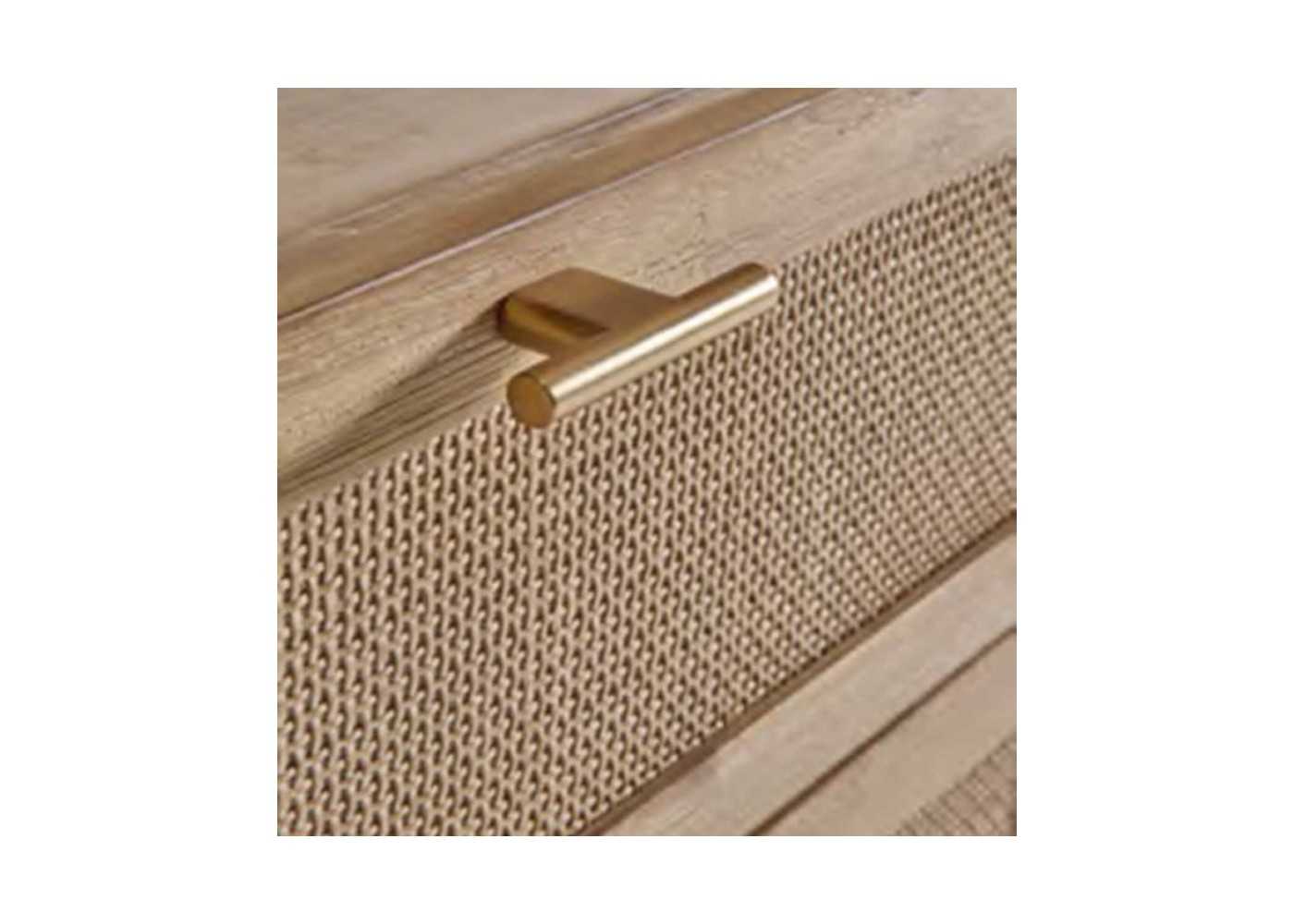 Mueble vajillero de madera maciza de acacia con 2 puertas y 2 cajones con frentes en fibra natural de ratán.Base y tiradores de acero dorado.