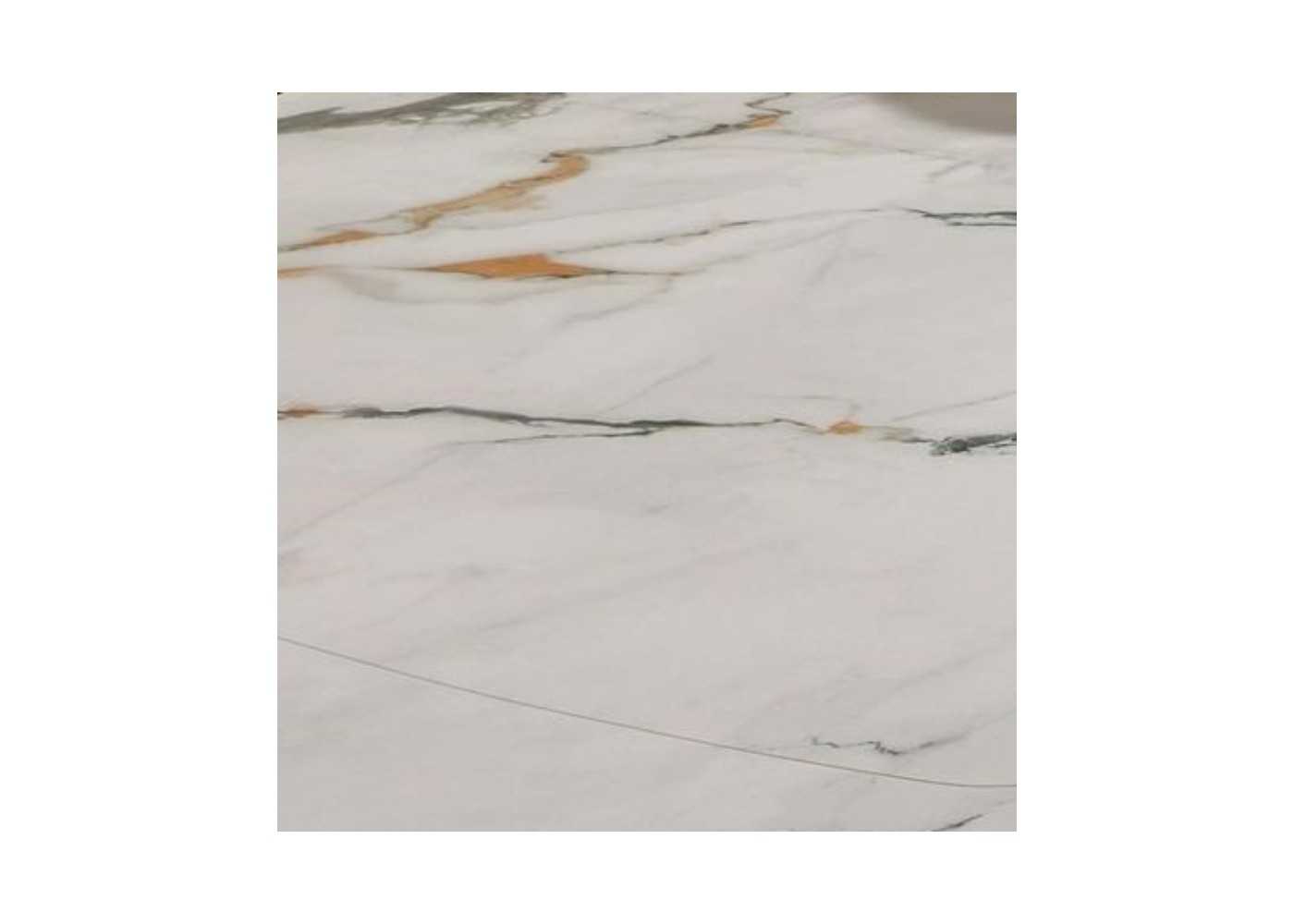 Tapa ovalada barril de mármol porcelánico blanco mate con vetas en tonos marrones y grises sobre cristal negro templado.