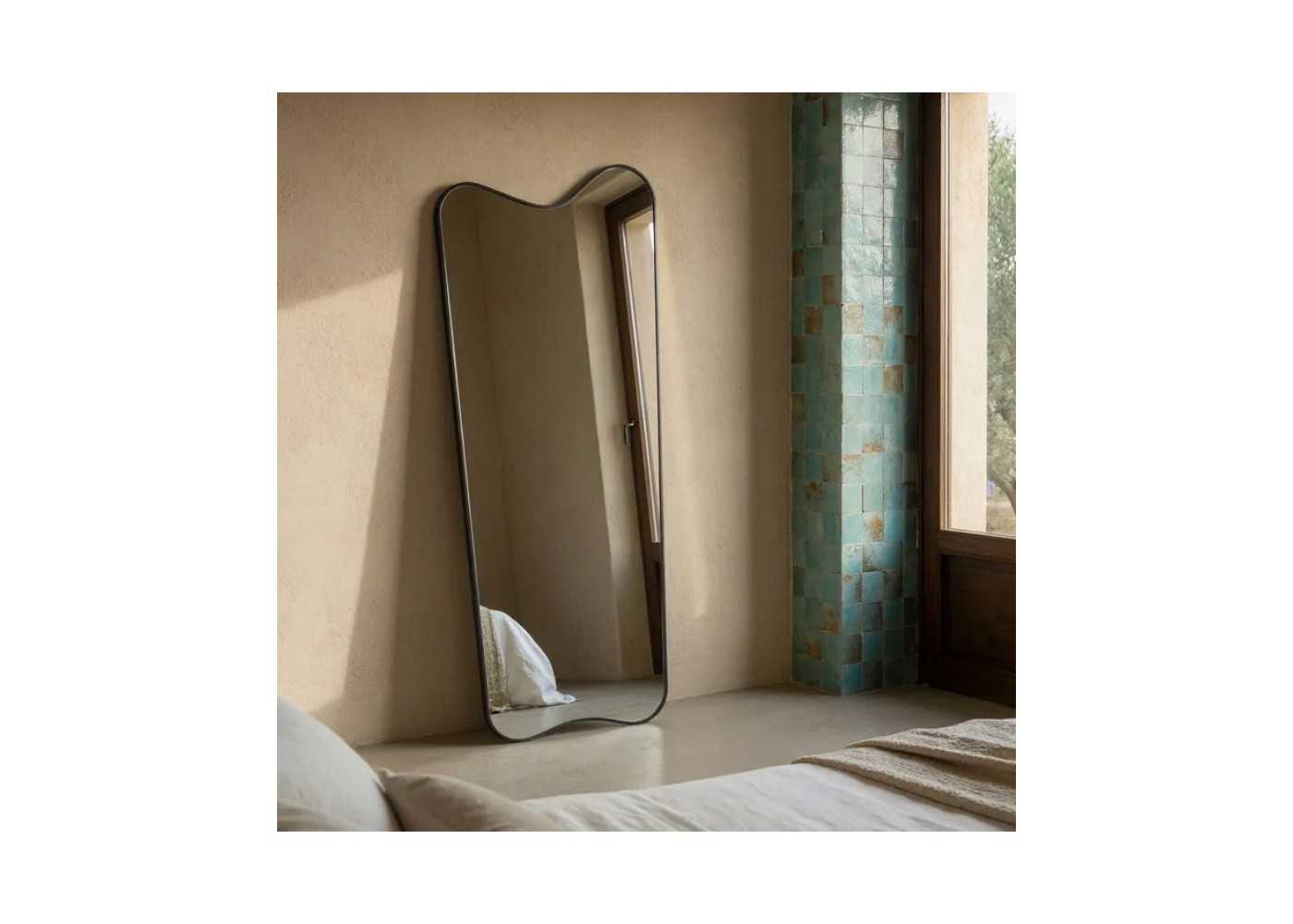 Elegante espejo de pie de diseño moderno y líneas redondeadas.