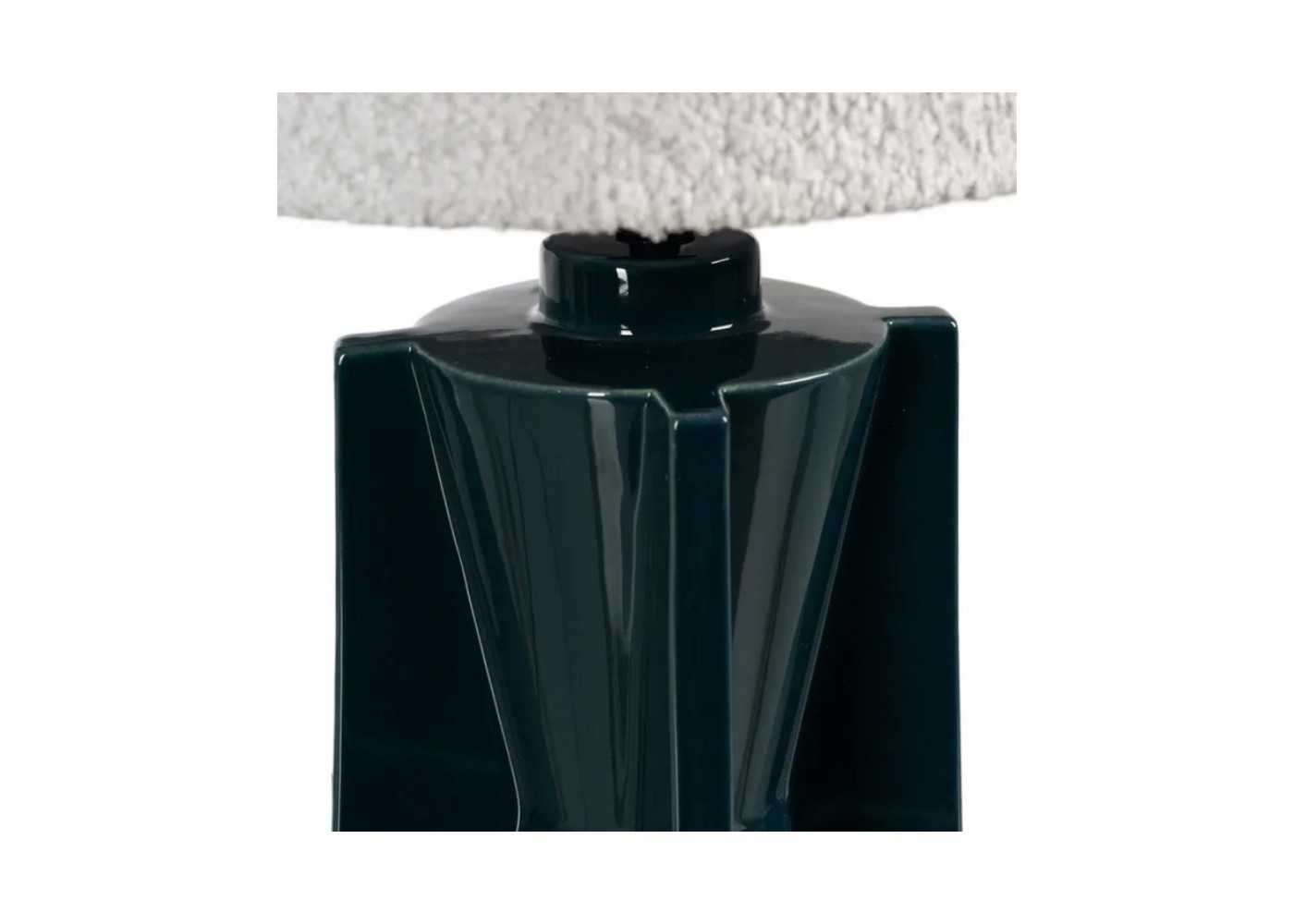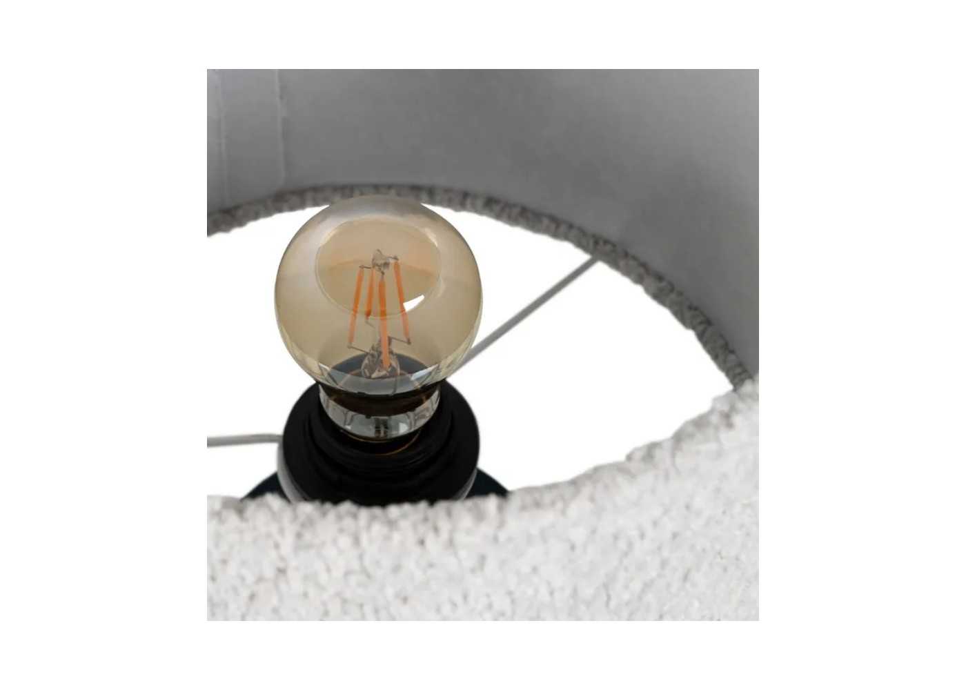 Elegante lámpara de sobremesa con base cerámica y pantalla en tela rizada color blanco.
