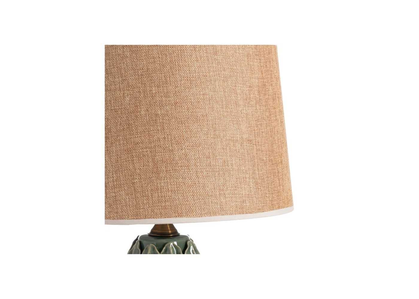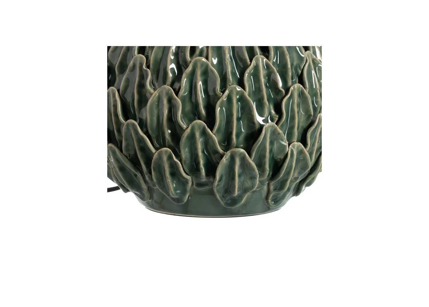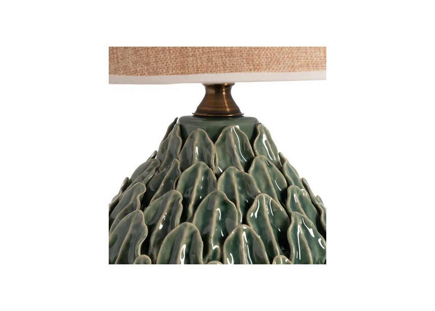 Elegante lámpara de mesa con base de cerámico en forma de hojas y tonos verdes.