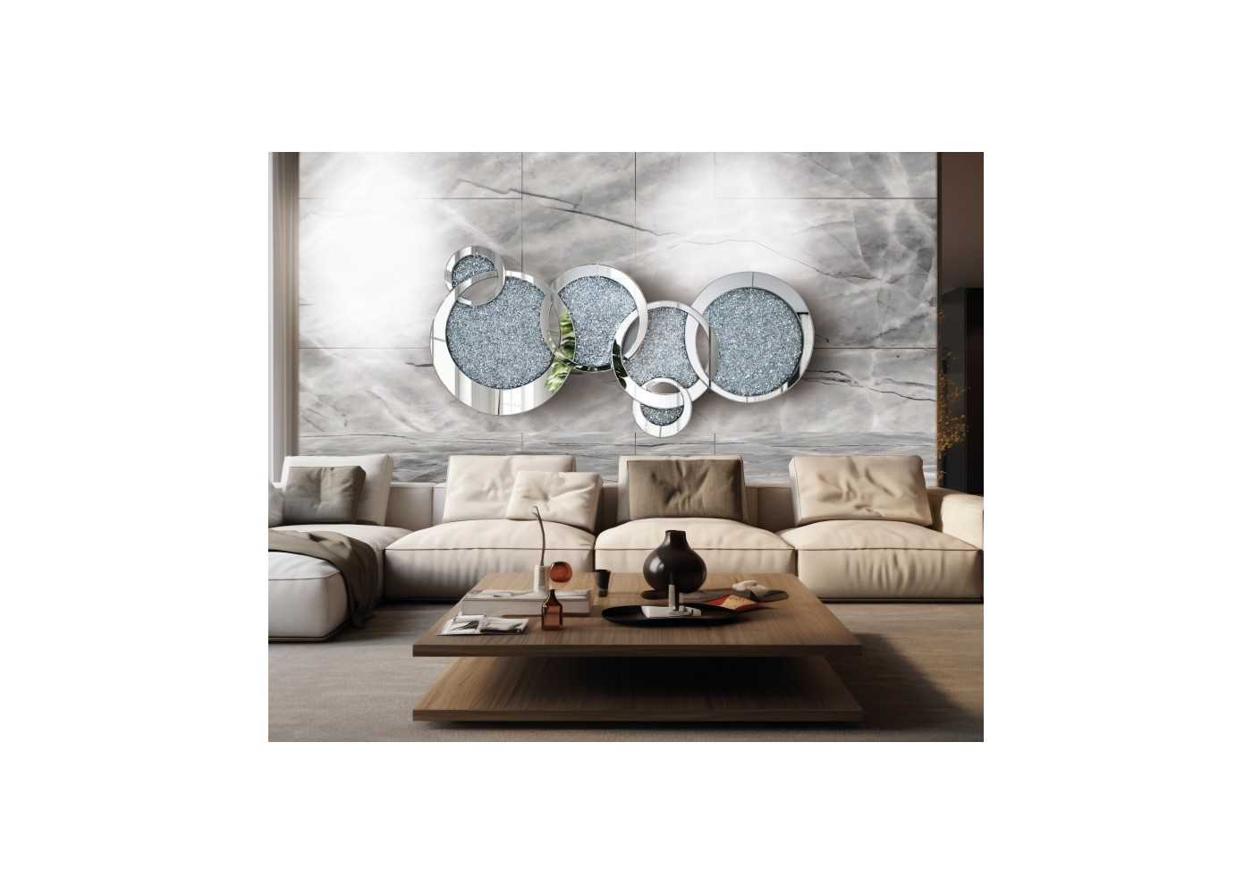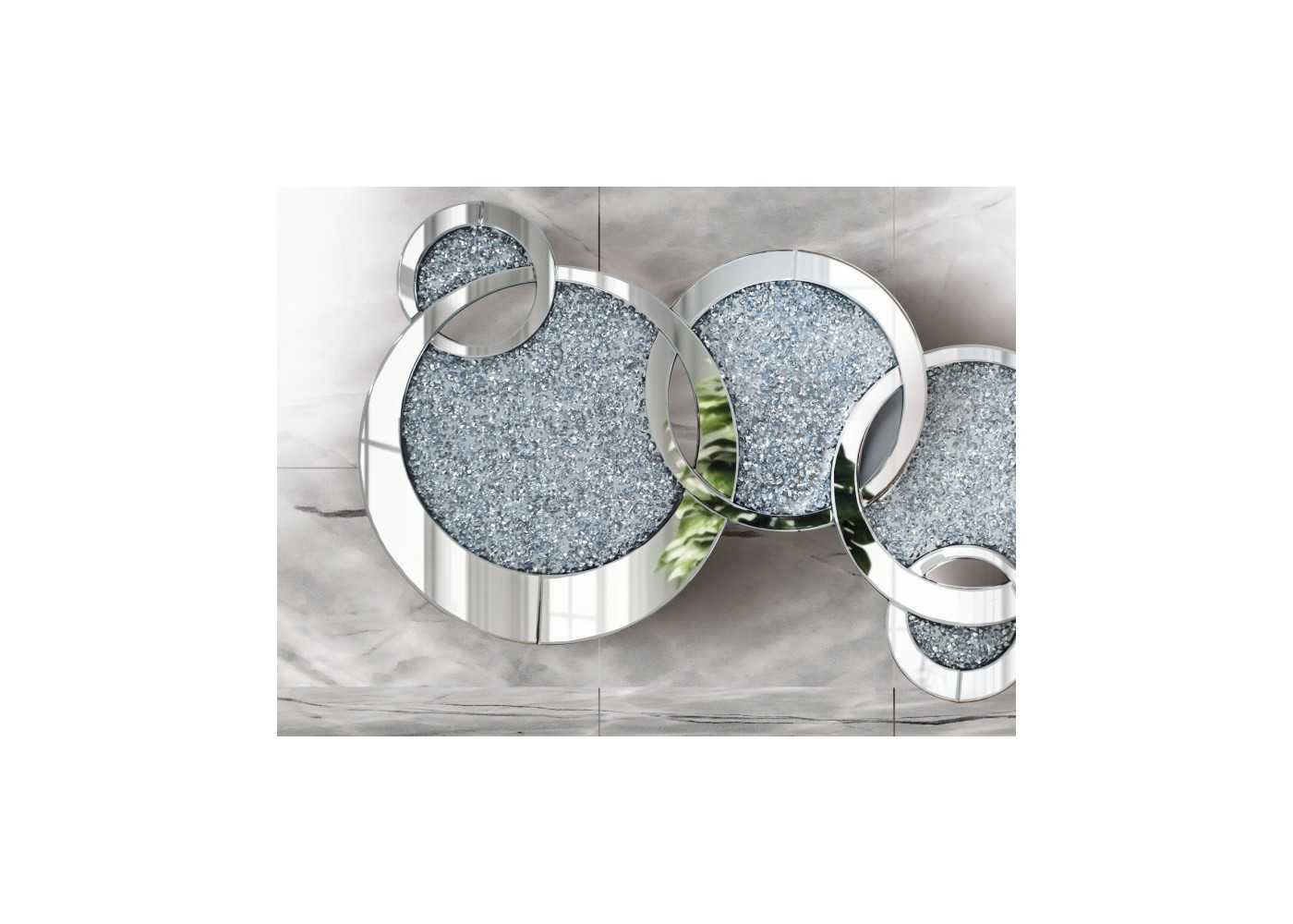 Original y elegante espejo formado por círculos entrelazados de diferentes tamaños fabricado con marcos de espejo e interiores decorados con pequeños cristales.
