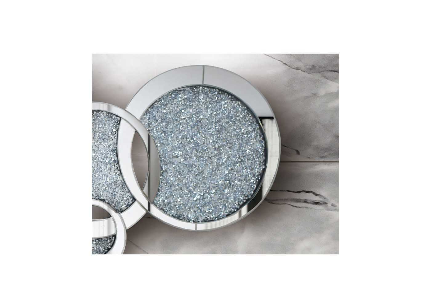 Interiores de los círculos con base de madera e incrustaciones de pequeños cristales para un mayor impacto.