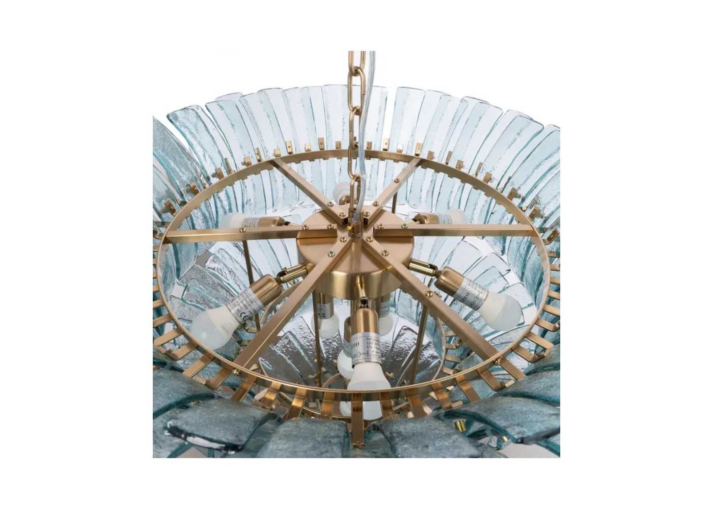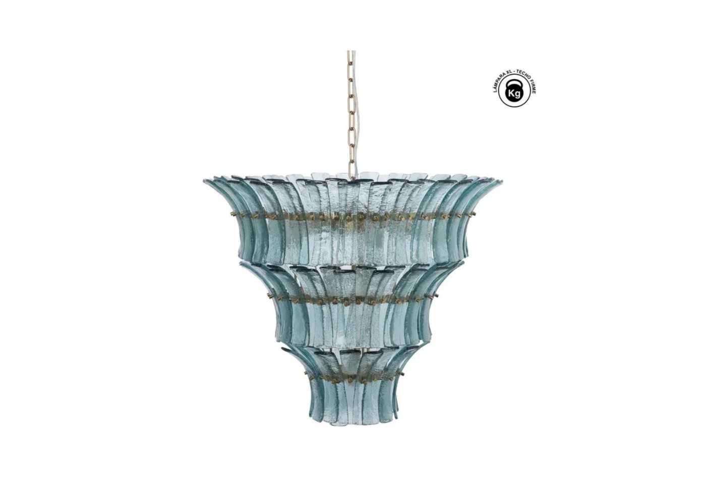 Elegante lámpara de techo compuesta por láminas convexas de cristal color verde azulado.