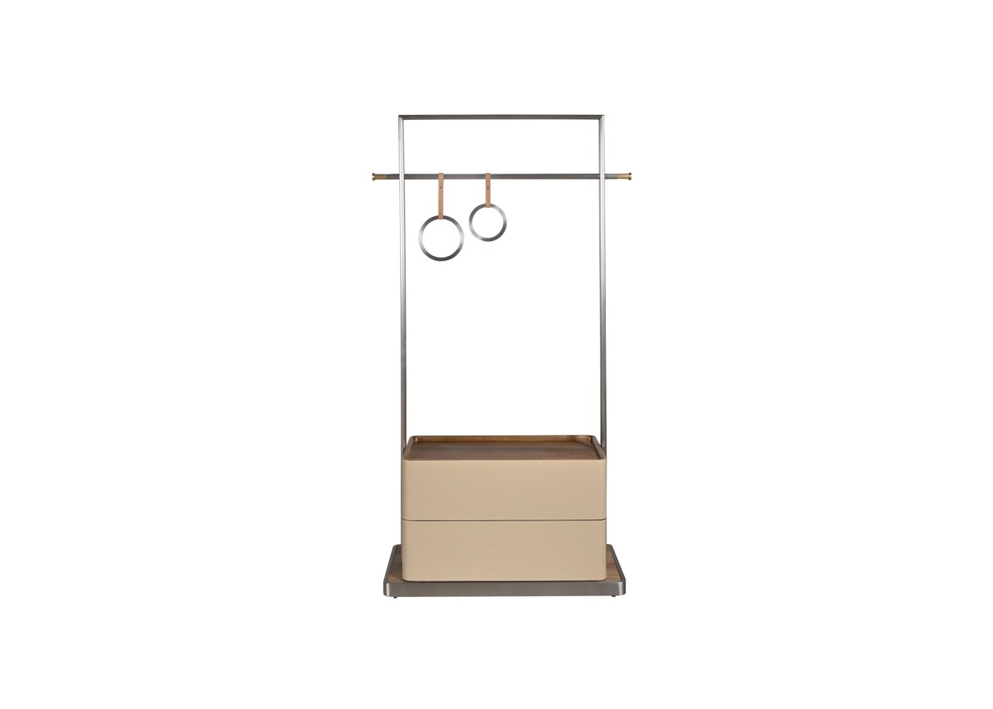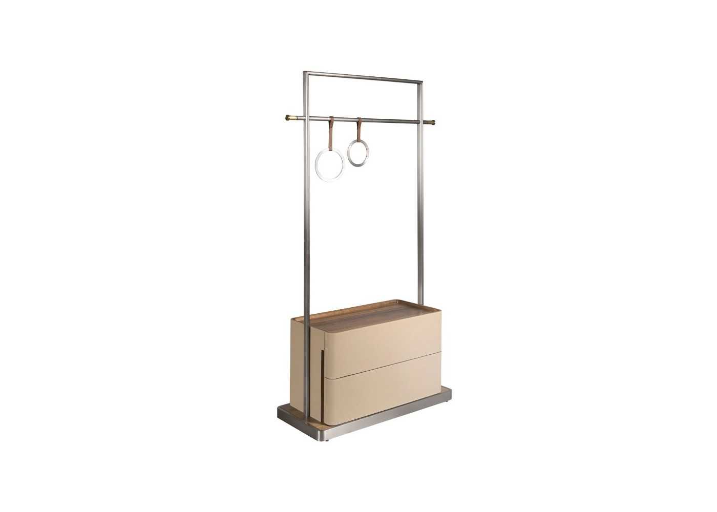 Práctico perchero con estructura de acero inoxidable pulido y cajonera fabricada en madera de fresno chapado en nogal con 2 cajones y frentes tapizados en piel genuina color visón.