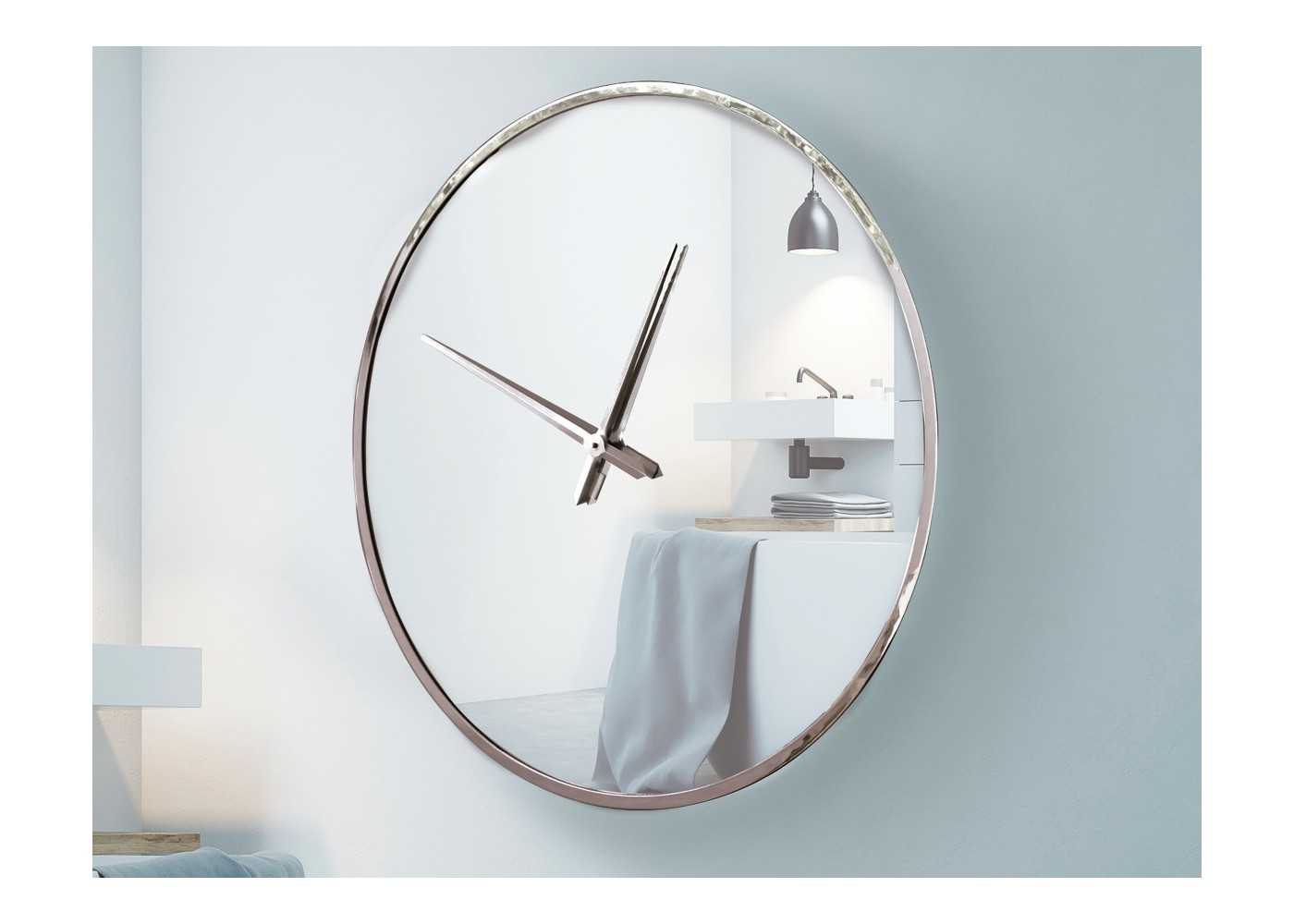 Espejo reloj redondo y biselado con marco de acero inoxidable.