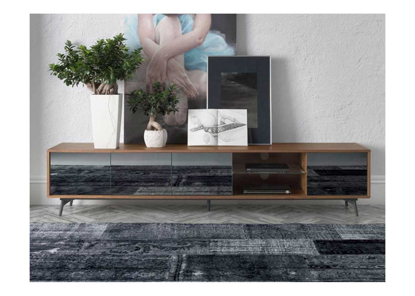 Mueble TV en nogal, cristal negro y base en acero inoxidable - MICHIGAN XL