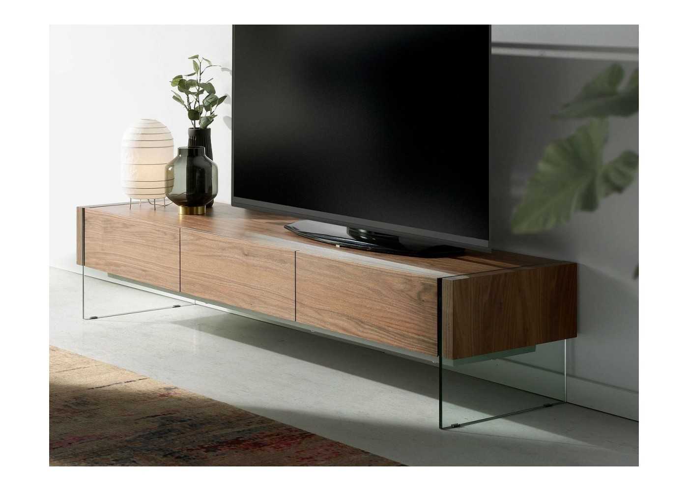 Mueble TV de diseño moderno con 3 cajones en madera chapada de nogal natural y patas de cristal templado.