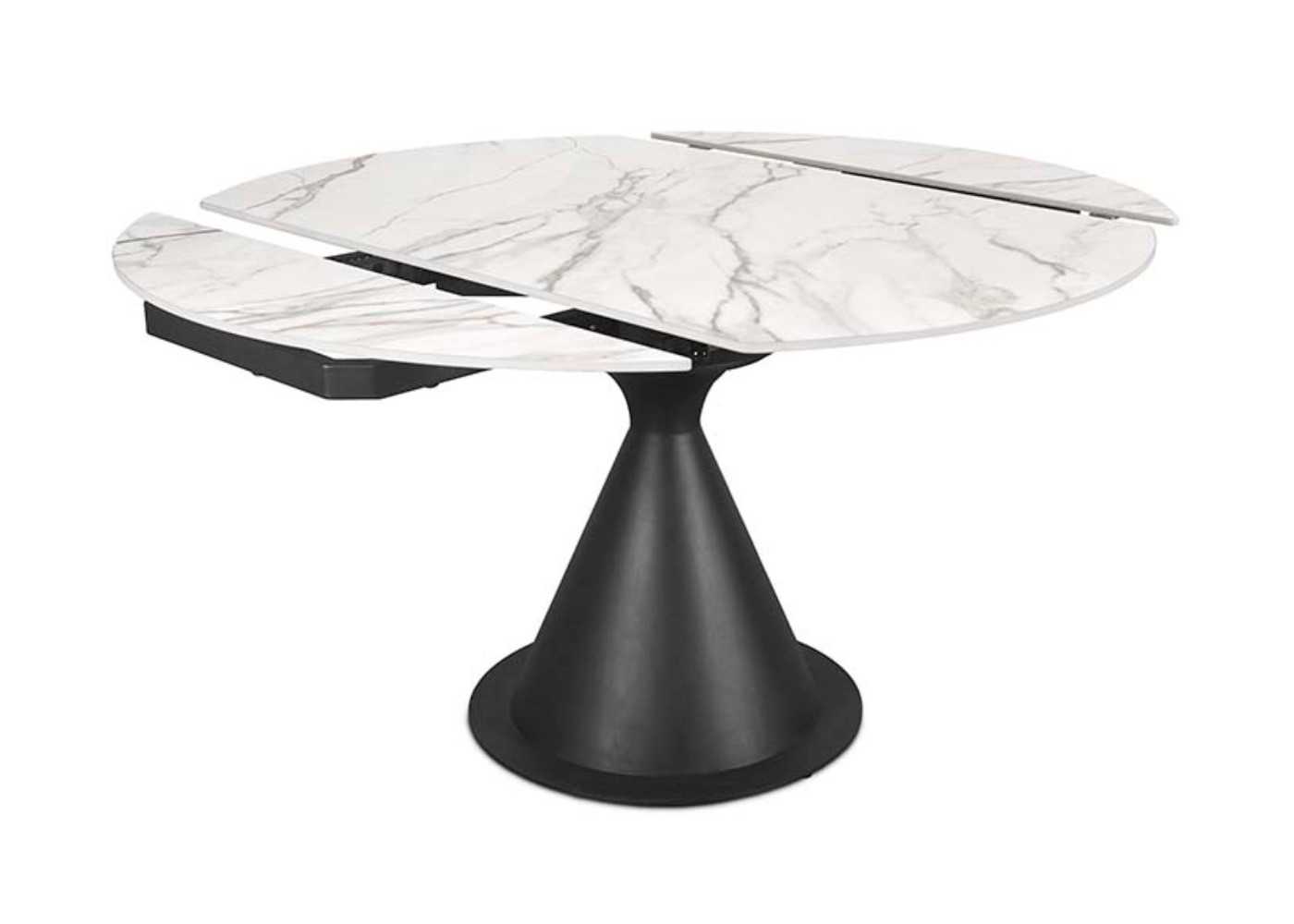 Original mesa de comedor con tapa barril convertible en tapa redonda de porcelánico con base de acero lacado negro.