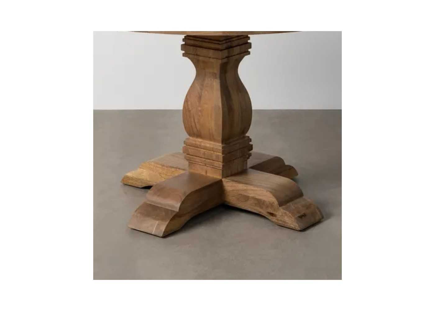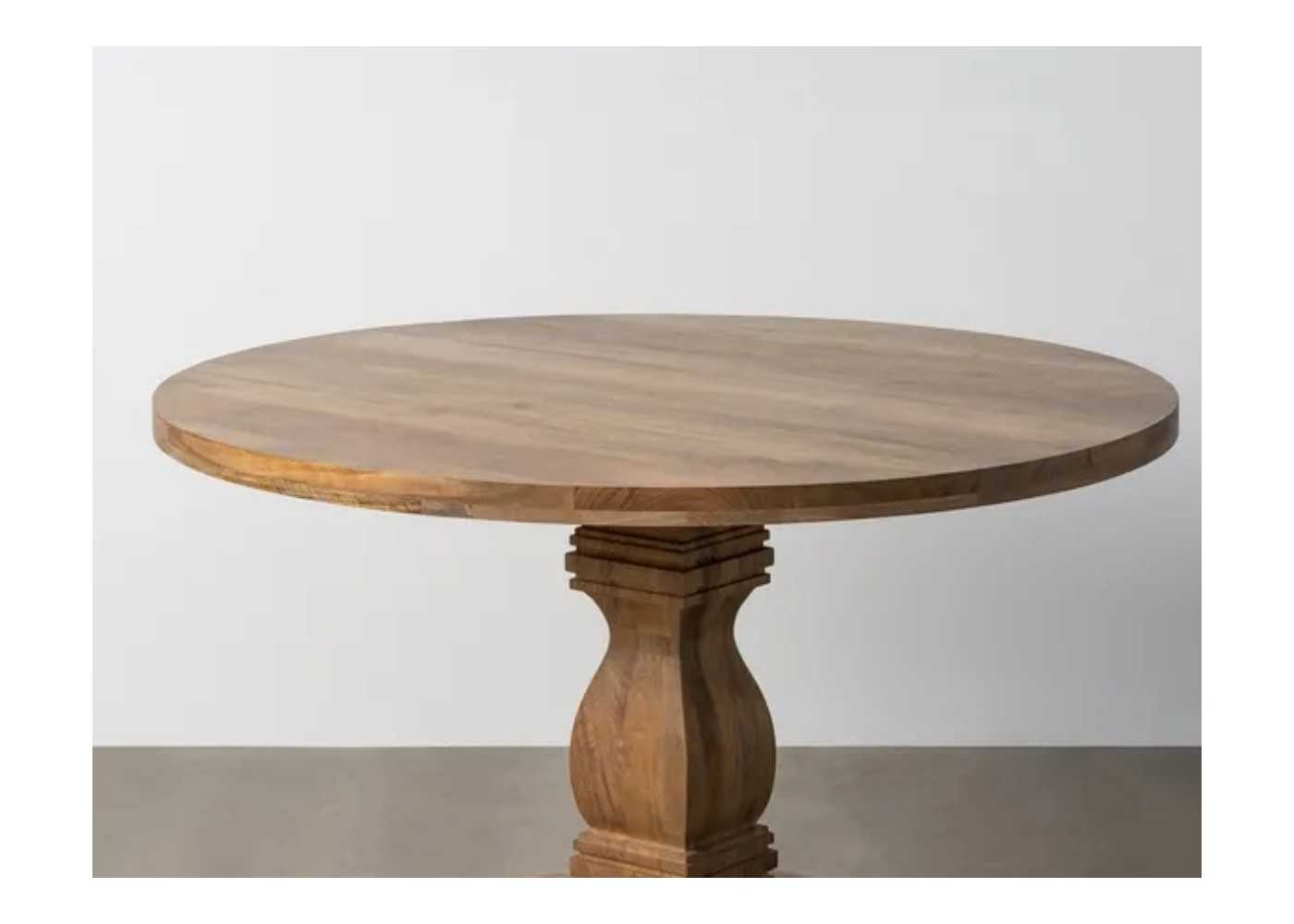 Elegante mesa de comedor redonda con tapa fija fabricada artesanalmente en madera maciza de mango color nogal natural.