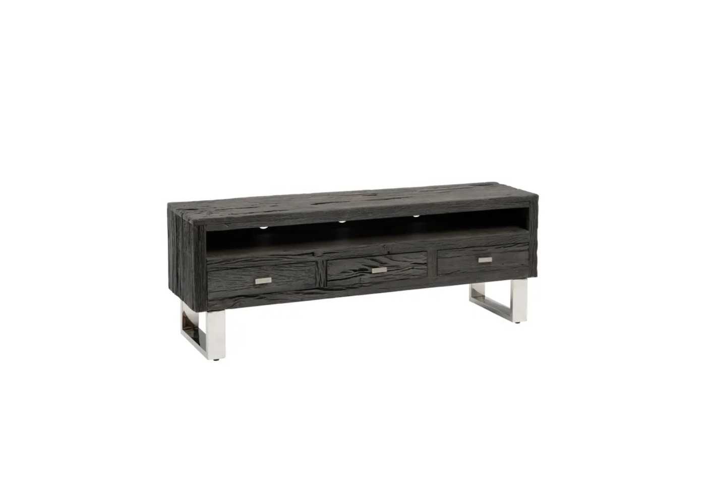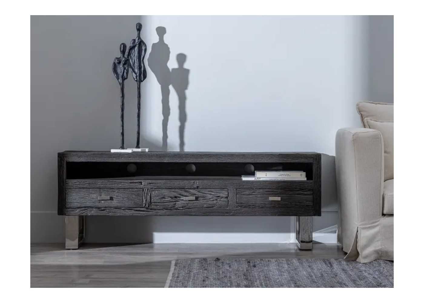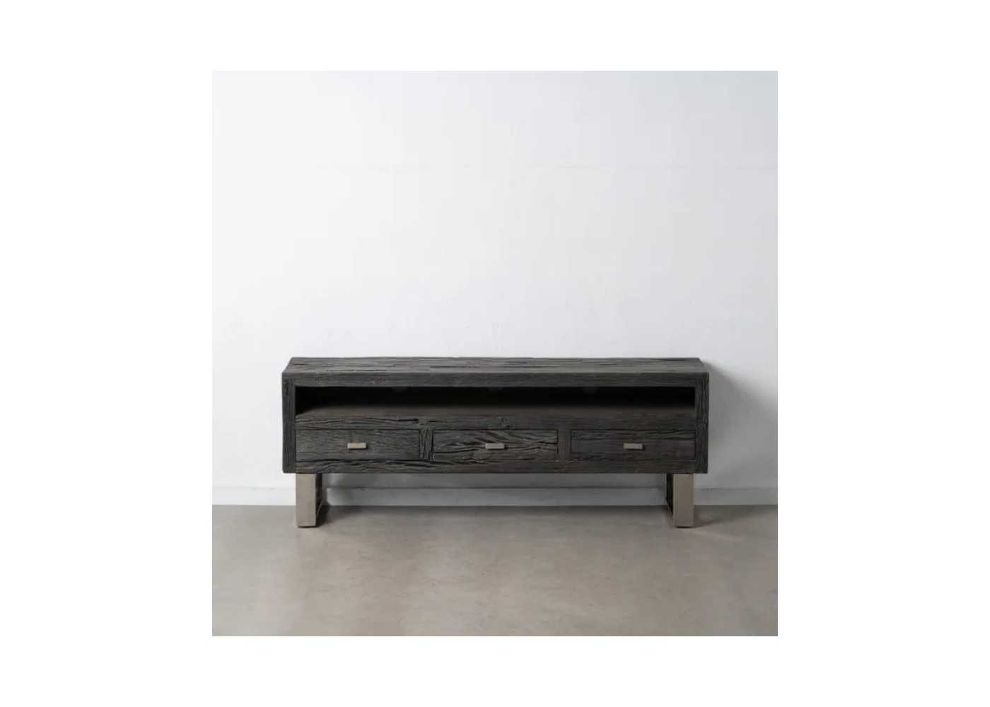 Original mueble TV de madera tratada con 3 cajones y hueco. Patas de acero inoxidable.