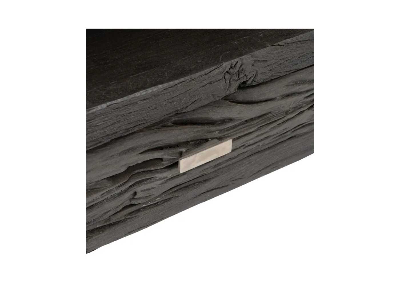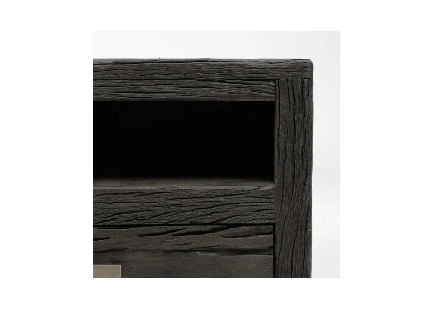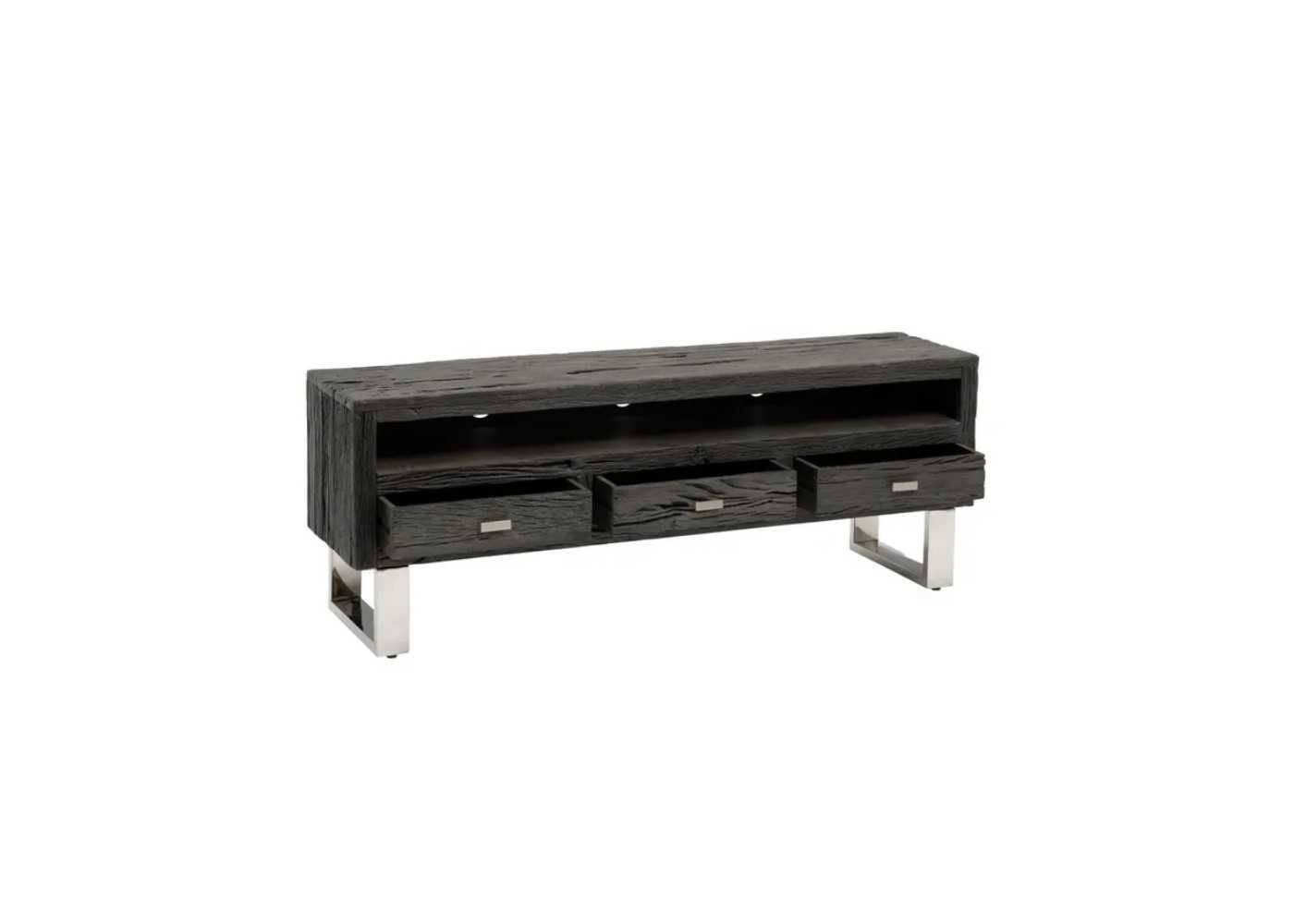 Original mueble TV de madera tratada con 3 cajones y hueco. Patas de acero inoxidable.