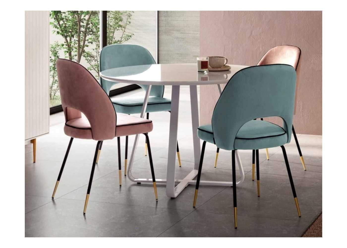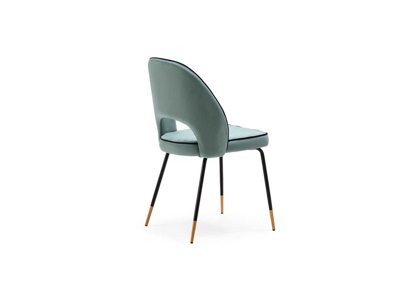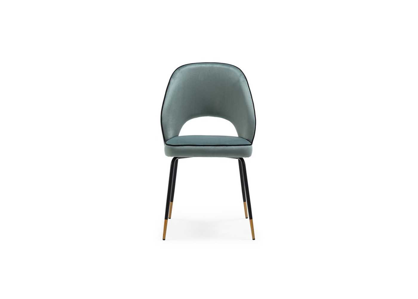 Silla de diseño moderno con estructura de acero lacado negro epoxi y detalle dorado en las patas. Asiento y respaldo tapizado en terciopelo verde