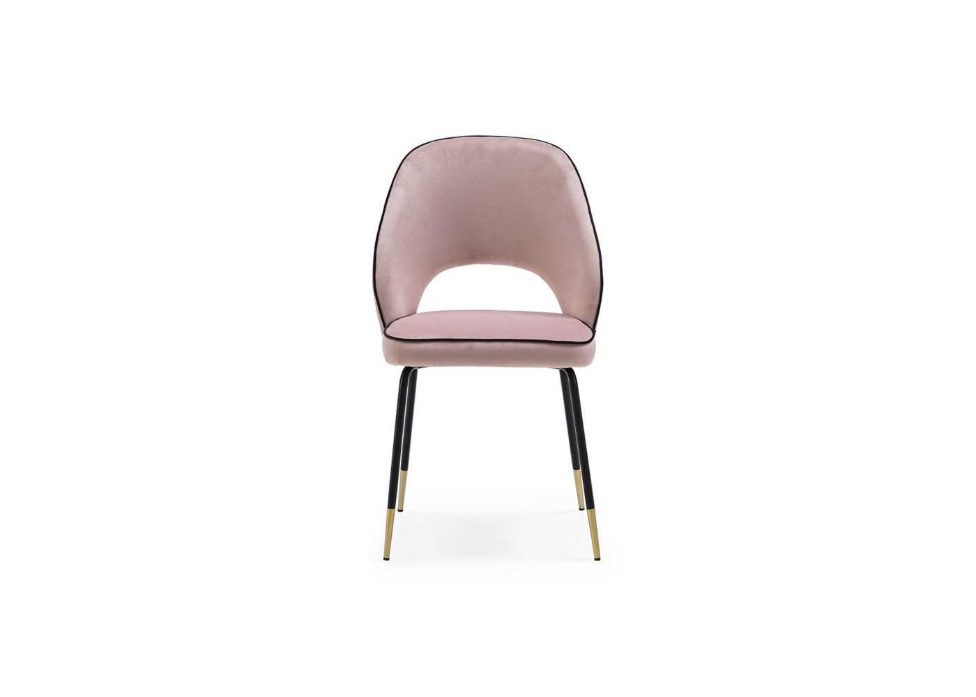 Silla de diseño moderno con estructura de acero lacado negro epoxi y detalle dorado en las patas. Asiento y respaldo tapizado en terciopelo rosa.