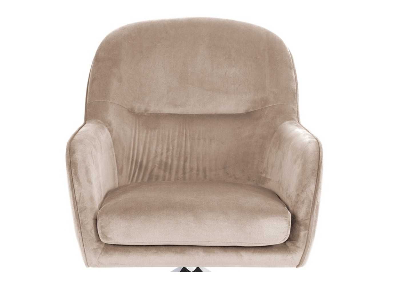 Elegante y confortable sillón giratorio con brazos tapizado en terciopelo color beige con patas de acero cromado.