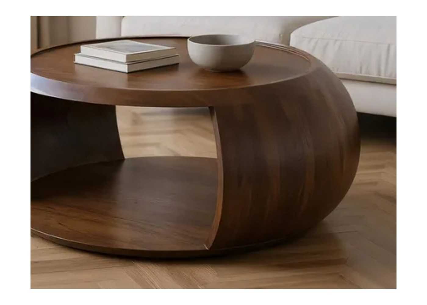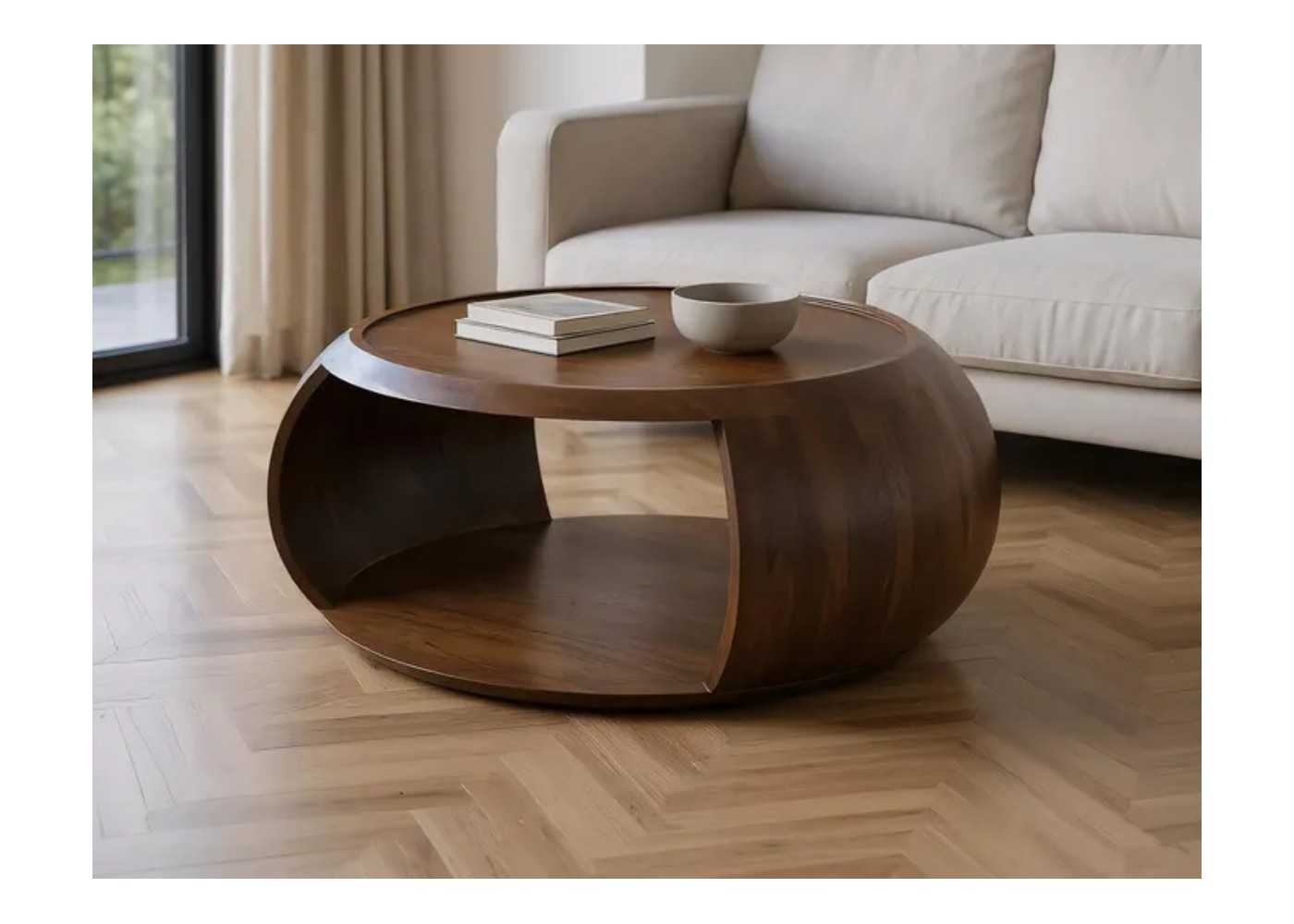 Original mesa de centro redonda fabricada en madera maciza de mango con hueco interior.