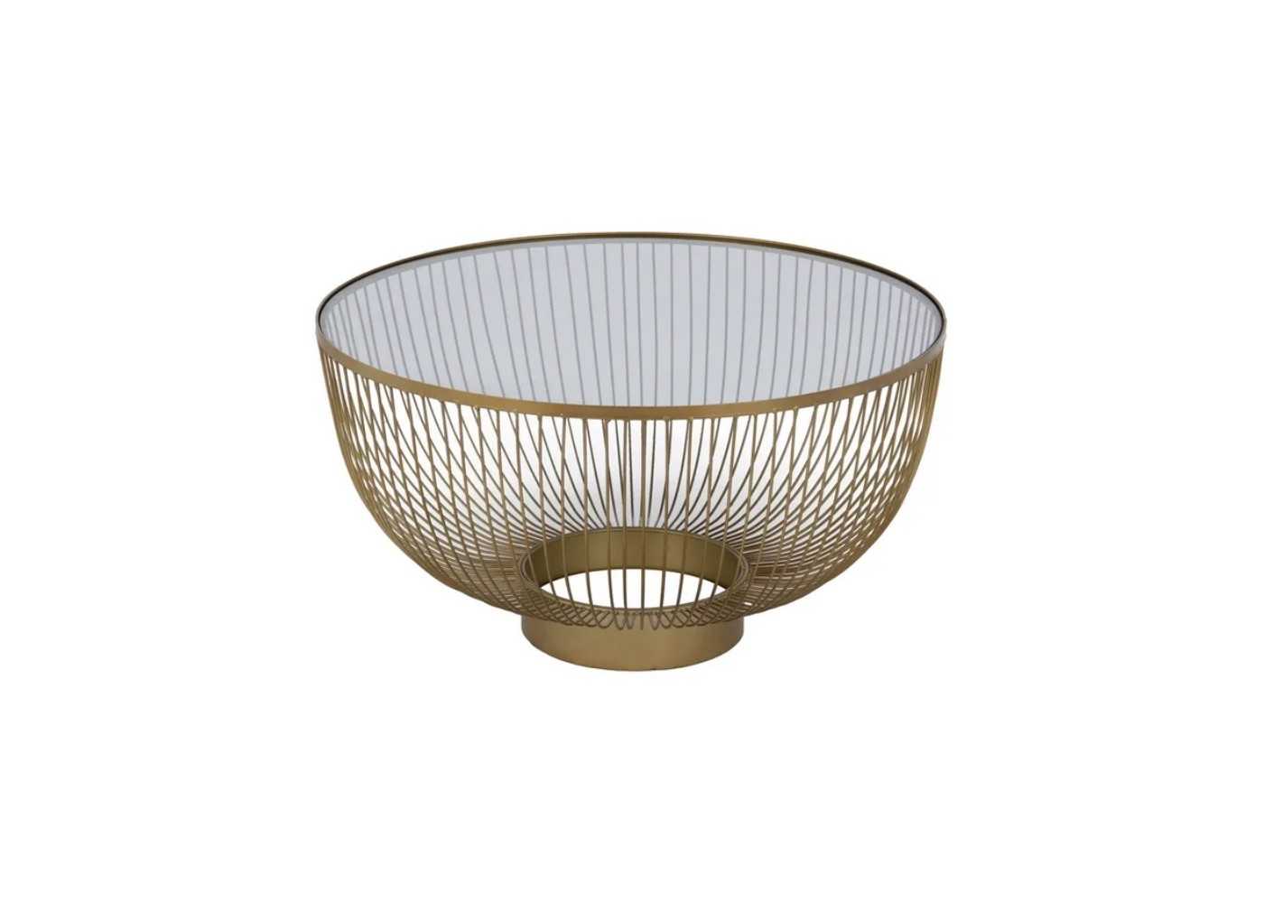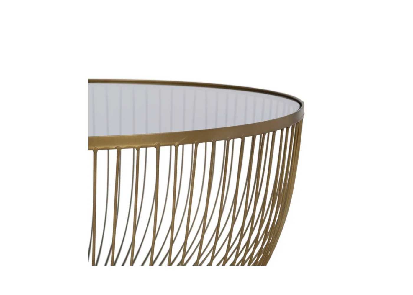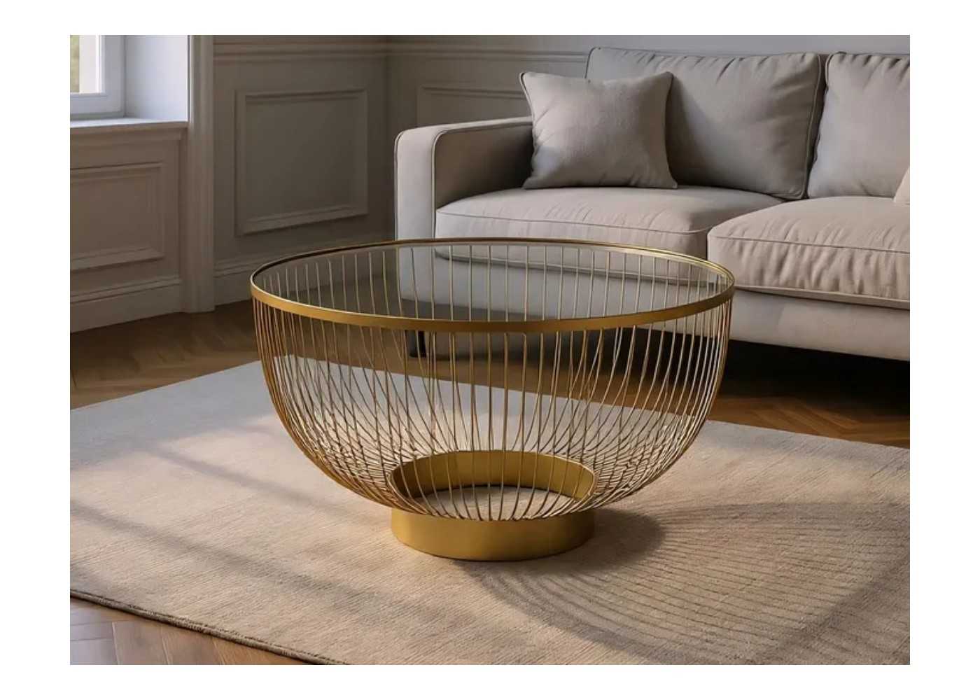 Mesa de centro redonda con tapa de cristal y original estructura de acero lacado oro mate.