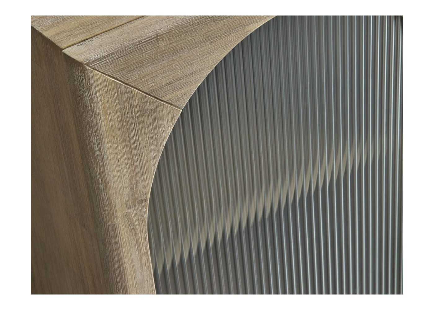 Original mueble TV de 2 puertas laterales y 2 huecos centrales en madera maciza de acacia con frentes de cristal rayado y texturizado.