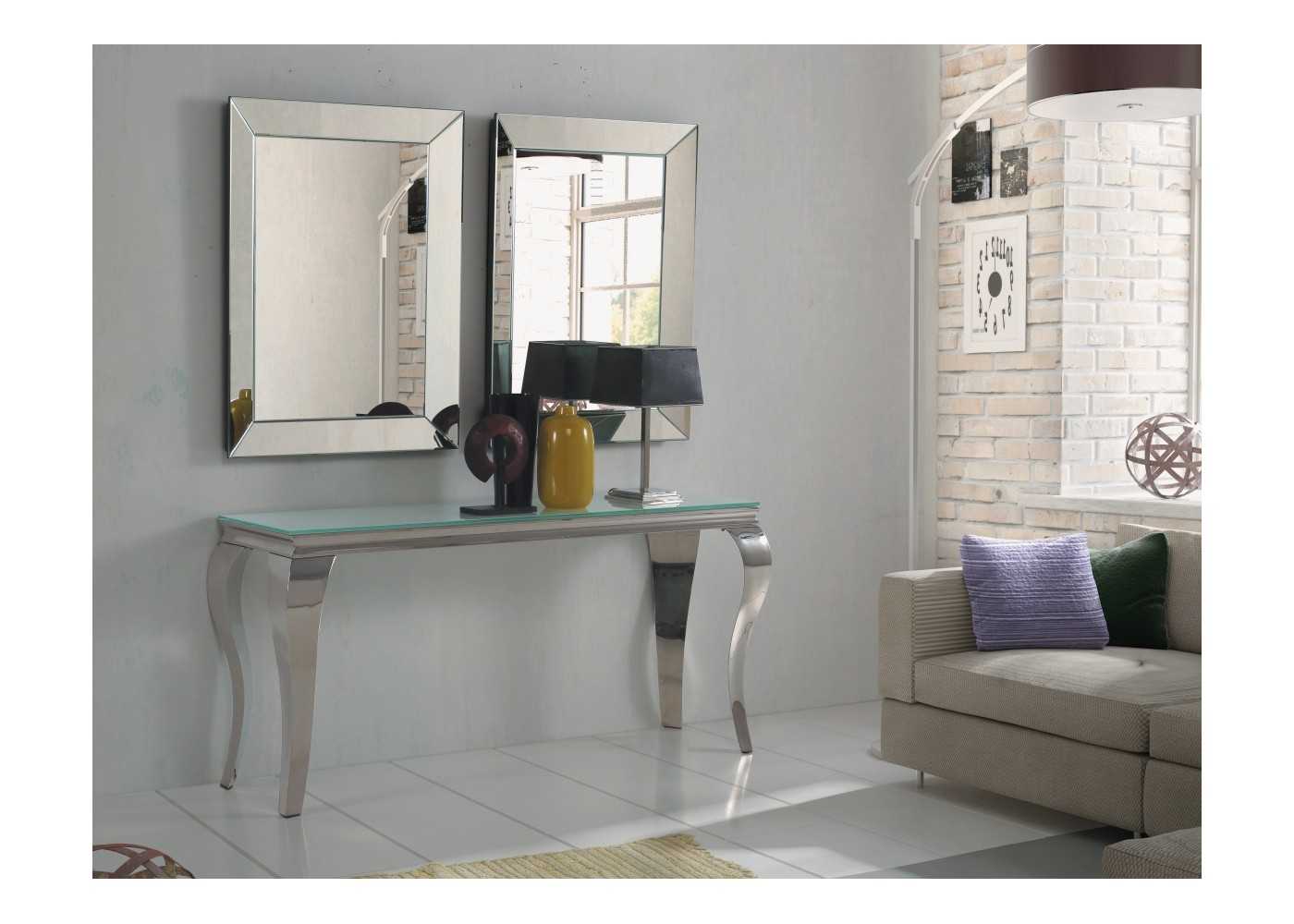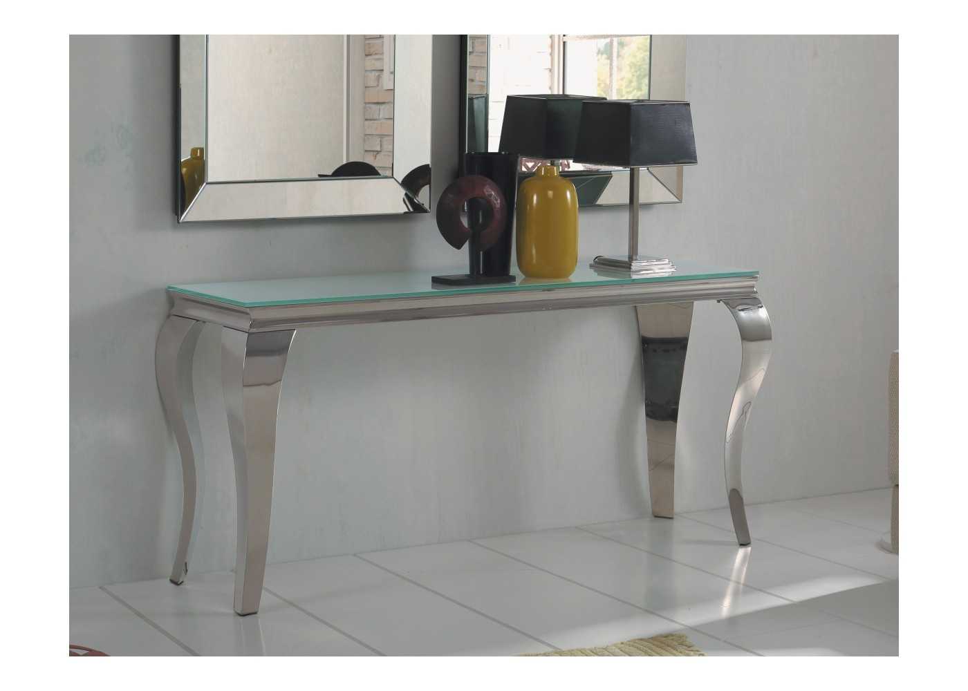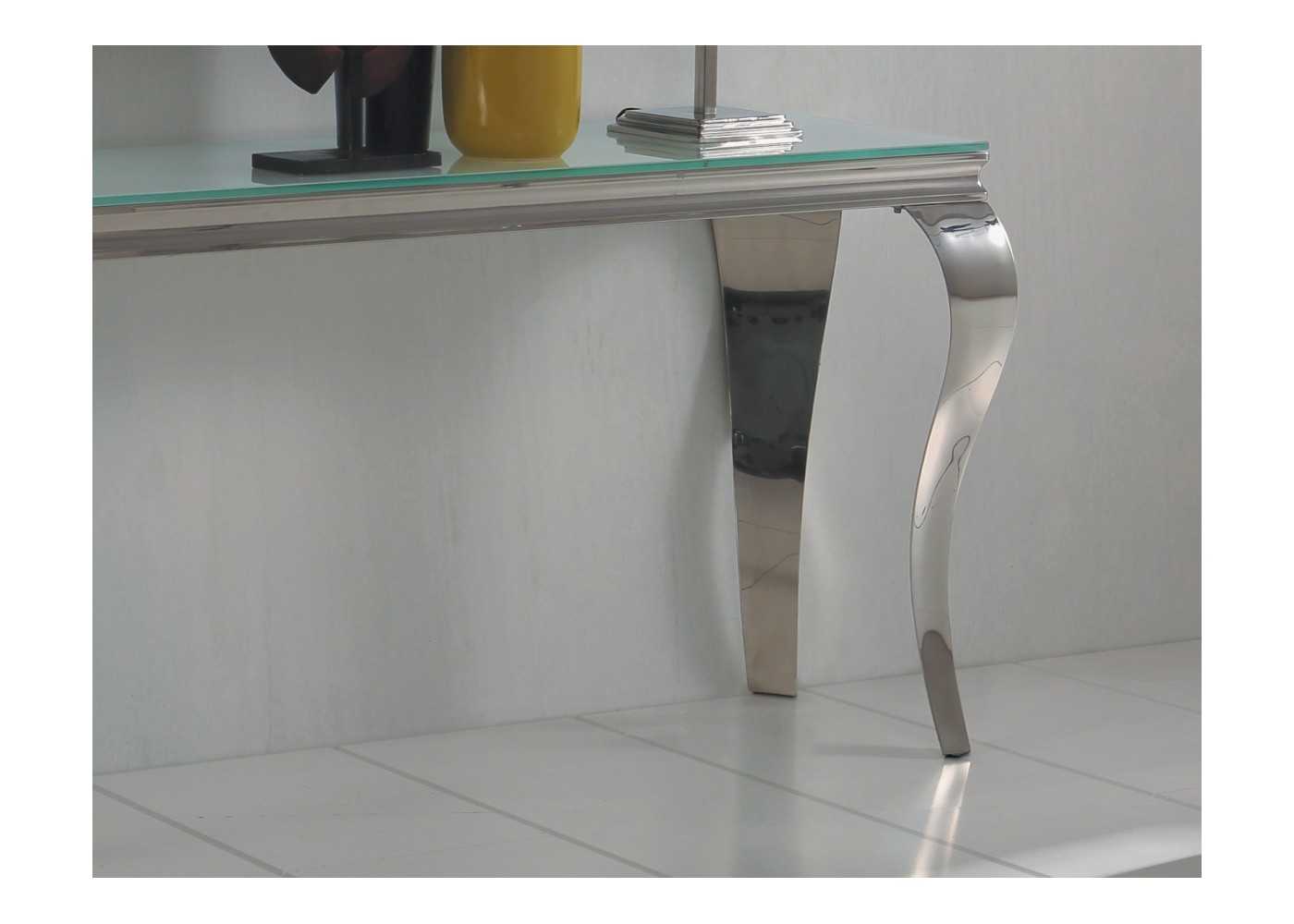 Elegante consola de diseño atemporal con patas chippendale fabricada en acero inoxidable con tapa de cristal.