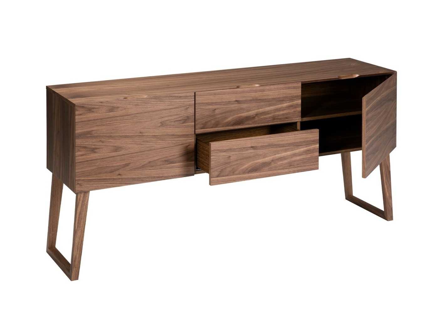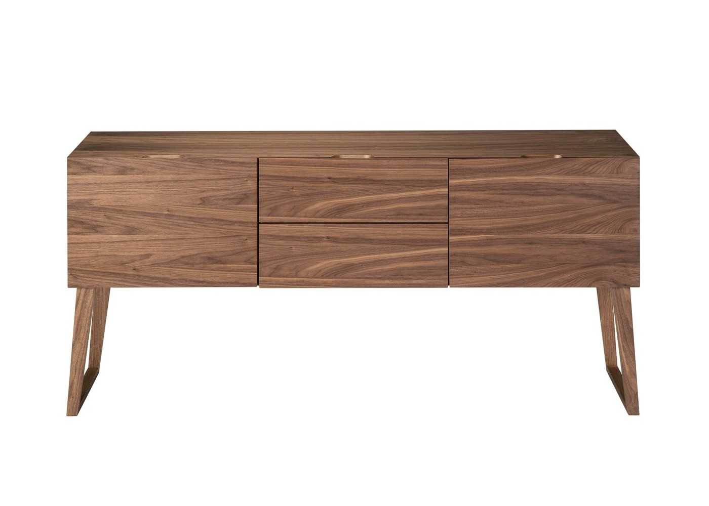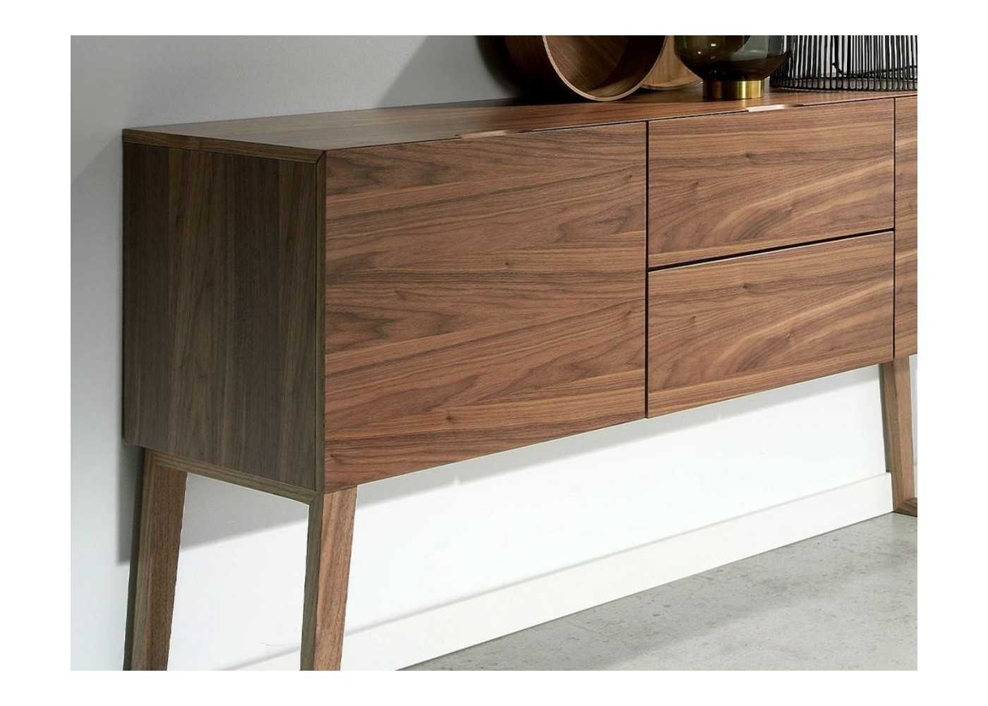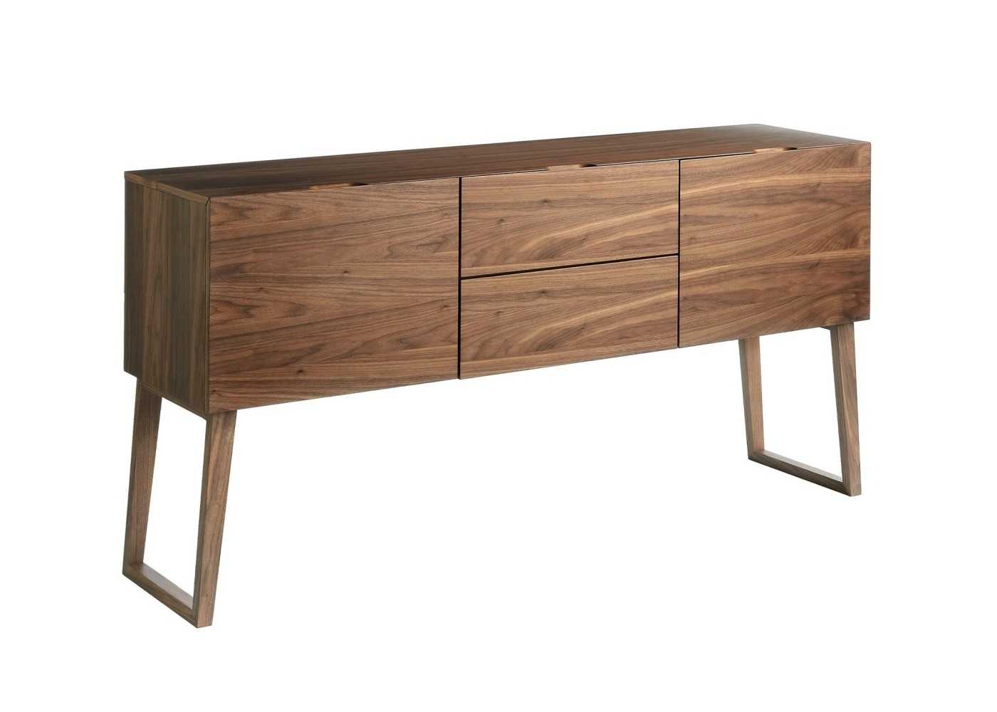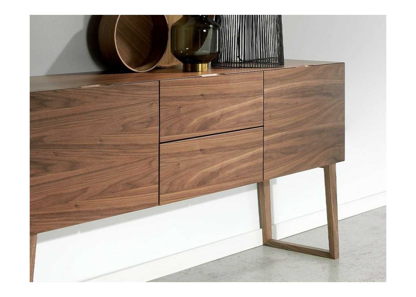 Aparador de diseño moderno en madera chapada de nogal natural con 2 puertas laterales y 2 cajones centrales para almacenamiento.