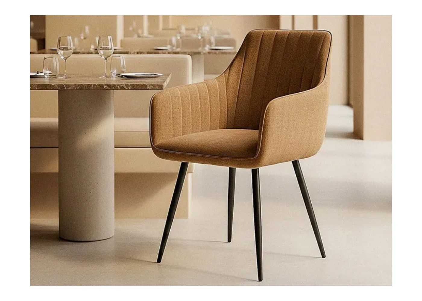 Silla de diseño moderno con respaldo y brazos envolventes tapizada en tela color MARRÓN con estructura de patas en acero lacado negro.