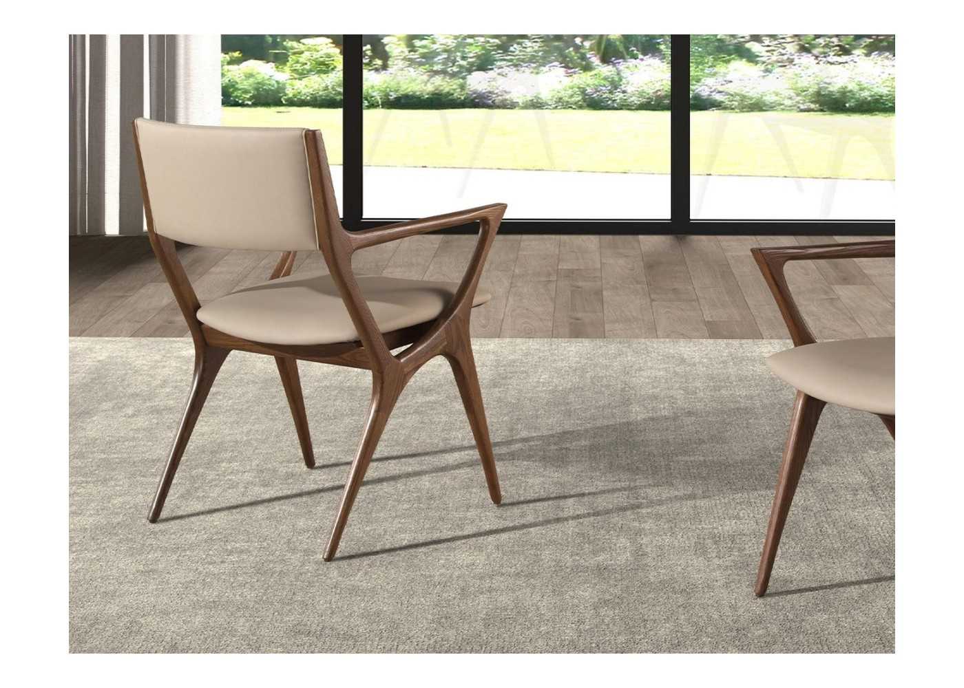 Silla de diseño moderno con reposabrazos de madera maciza tapizada en piel sintética color visón.
