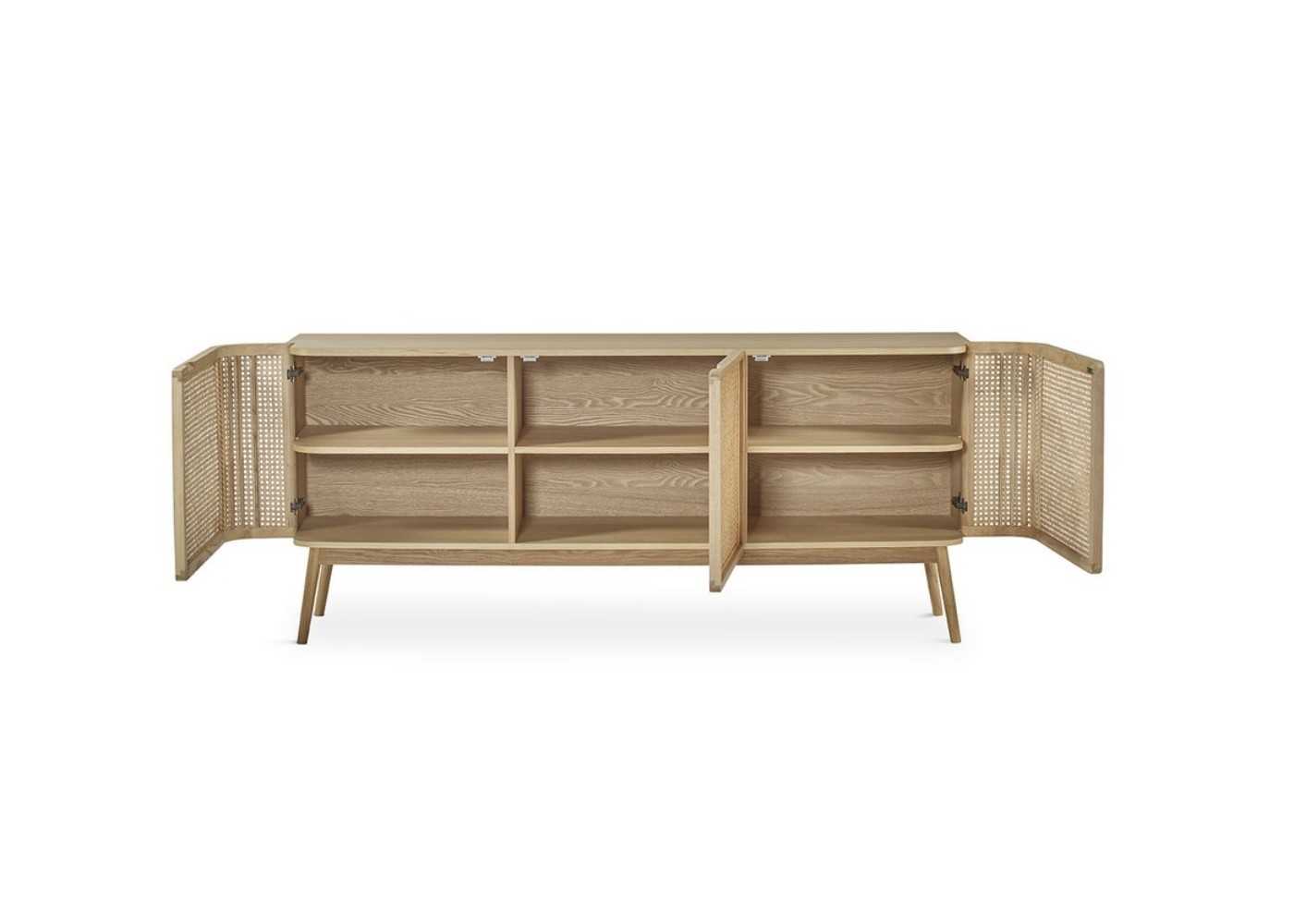 Fabricado en madera maciza de roble acabado natural con originales frentes de puertas en rejilla de fibra natural.