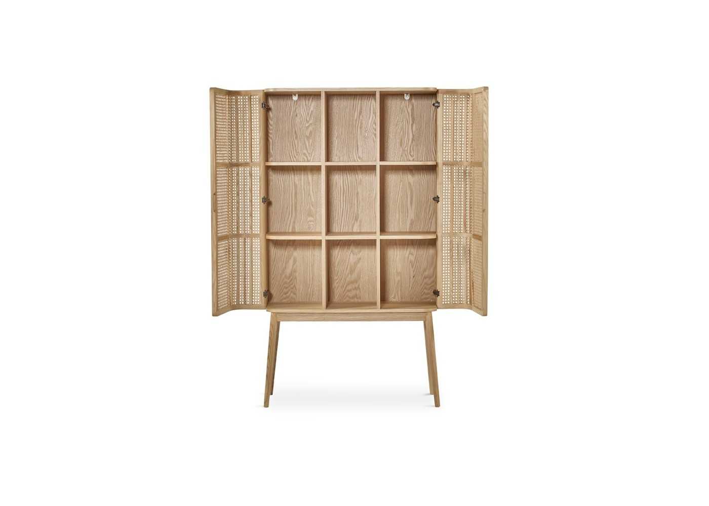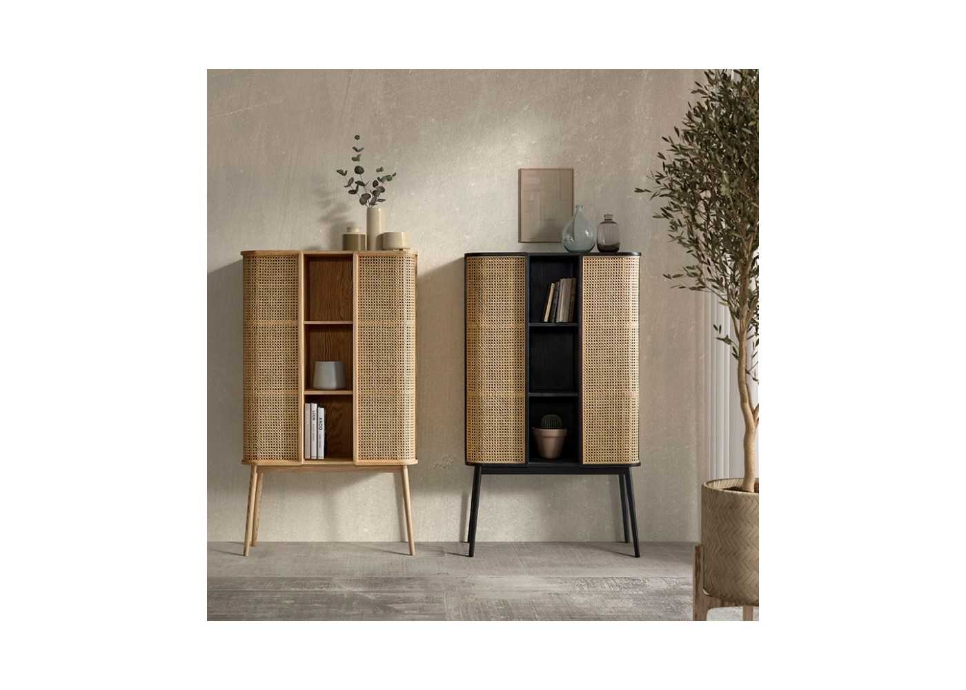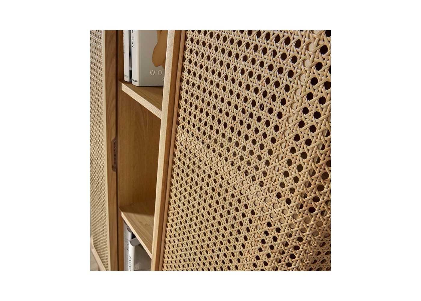 Fabricado en madera maciza de roble acabado natural con originales frentes de puertas en rejilla de fibra natural.