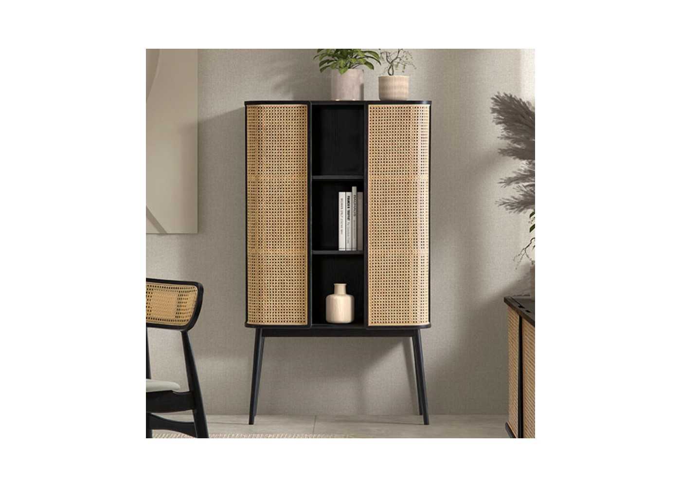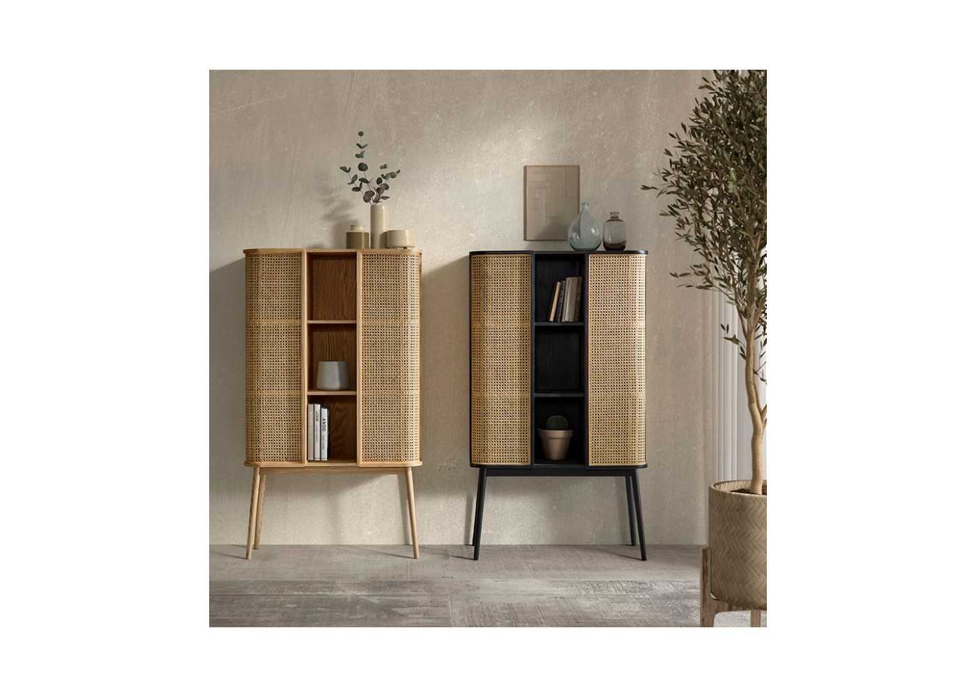 Fabricado en madera maciza de roble acabado negro tintado con originales frentes de puertas en rejilla de fibra natural.