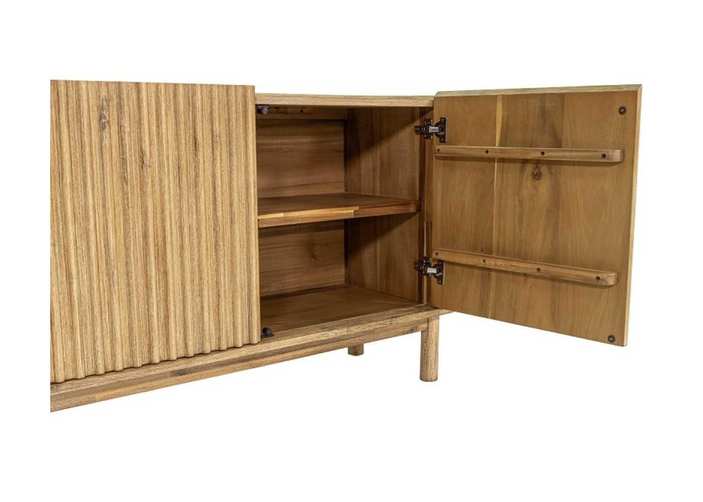 Pequeño aparador de madera maciza de acacia con 2 puertas centrales y 2 puertas laterales redondeadas con frentes de puertas acanalados.