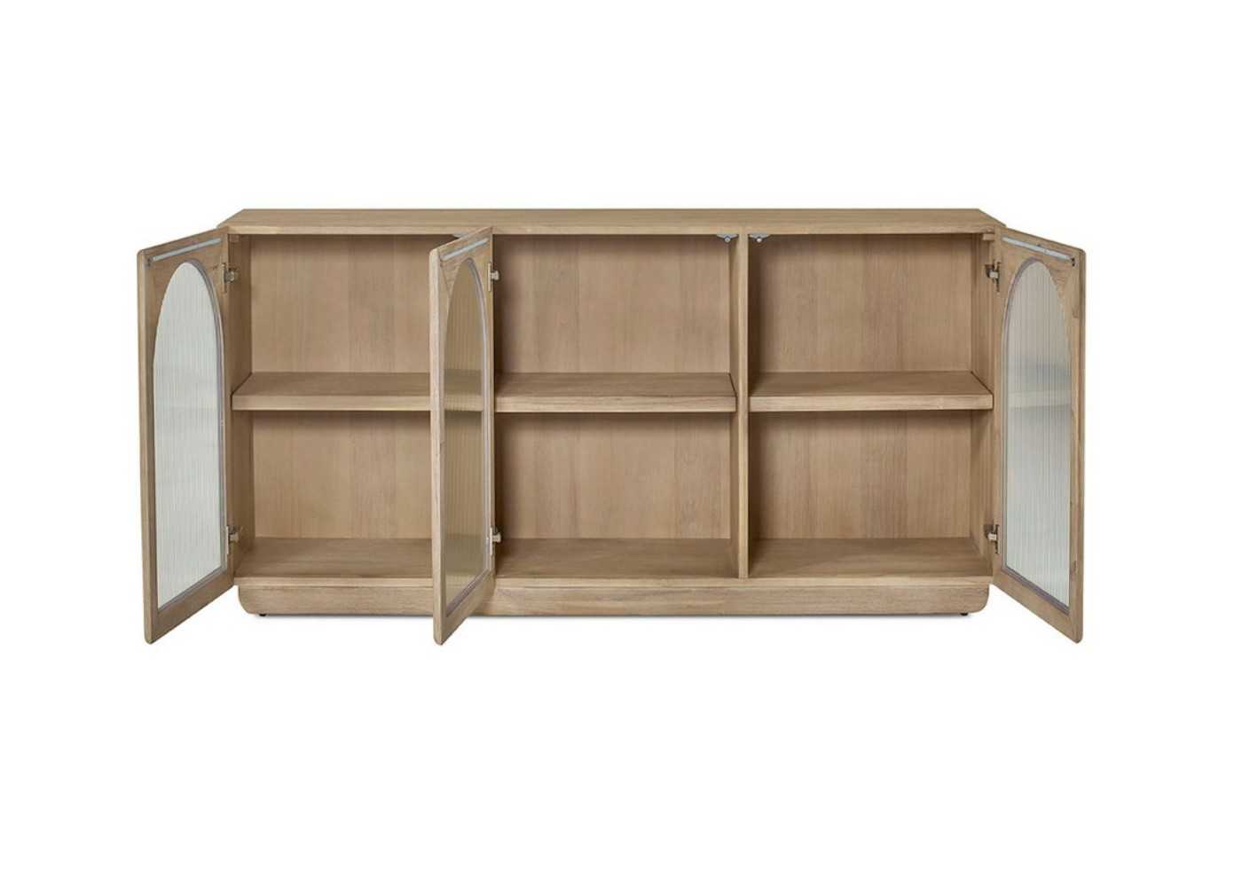 Original aparador de 3 puertas en madera maciza de acacia con frentes de cristal rayado y texturizado.
