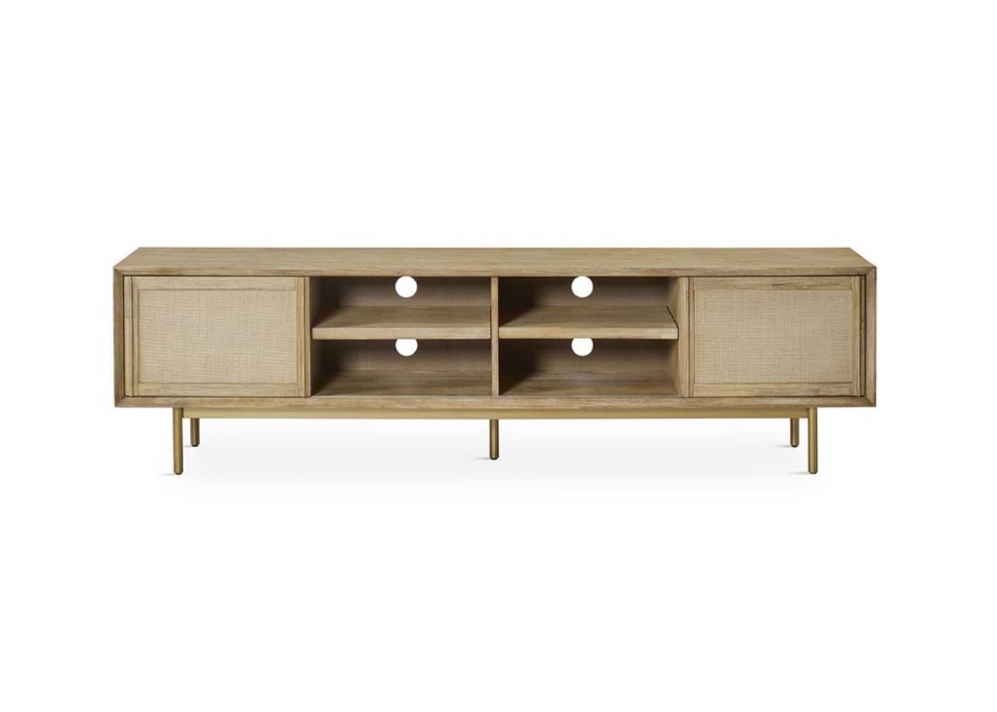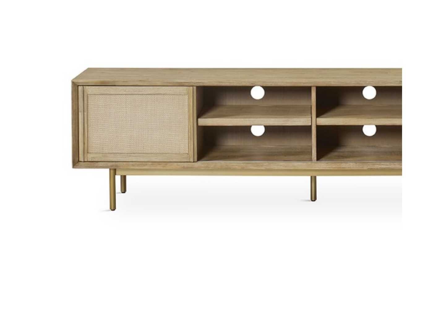 Práctico mueble TV de 2 puertas laterales y correderas y 2 huecos centrales con estante de madera maciza de acacia. Frentes de puertas correderas enmarcados con fibra natural de ratán. Base de acero dorado.