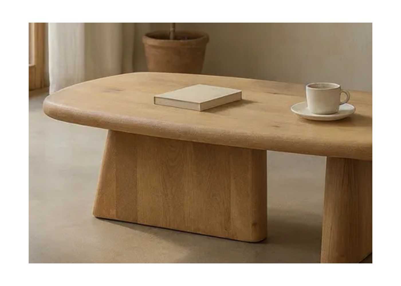 Elegante mesa de centro de estilo rústico y colonial fabricada de madera maciza de acacia con un diseño orgánico y líneas suaves y redondeadas.