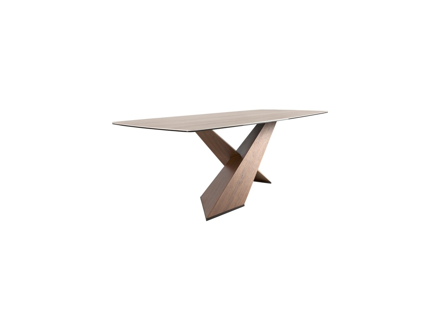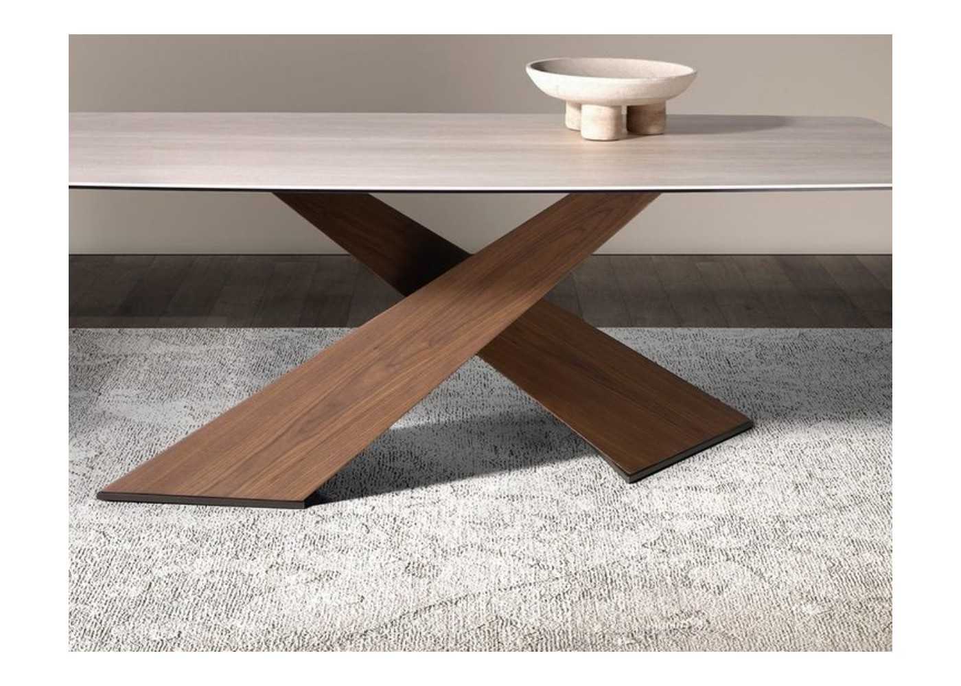 Mesa de comedor fija con tapa ovalada barril de mármol porcelánico color arena mate y originales patas cruzadas de madera maciza de fresno chapadas en nogal.