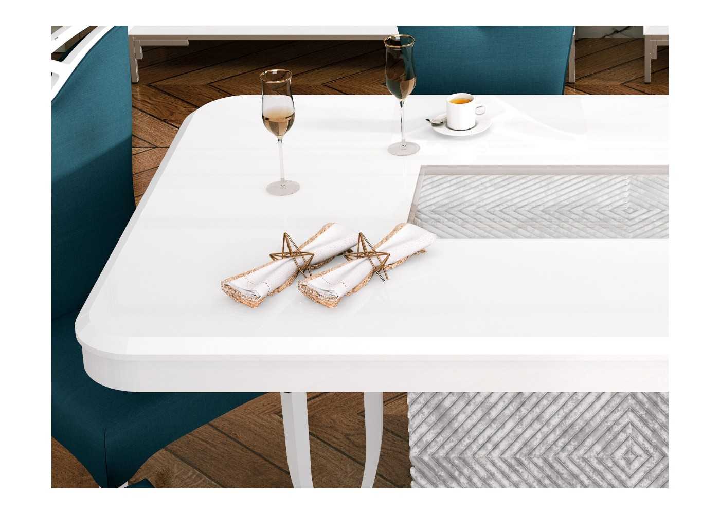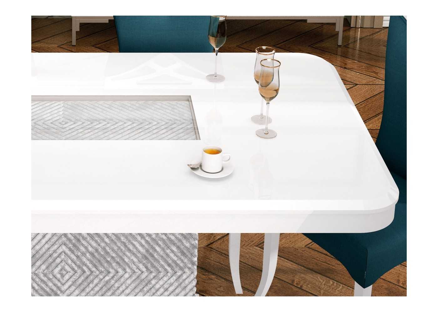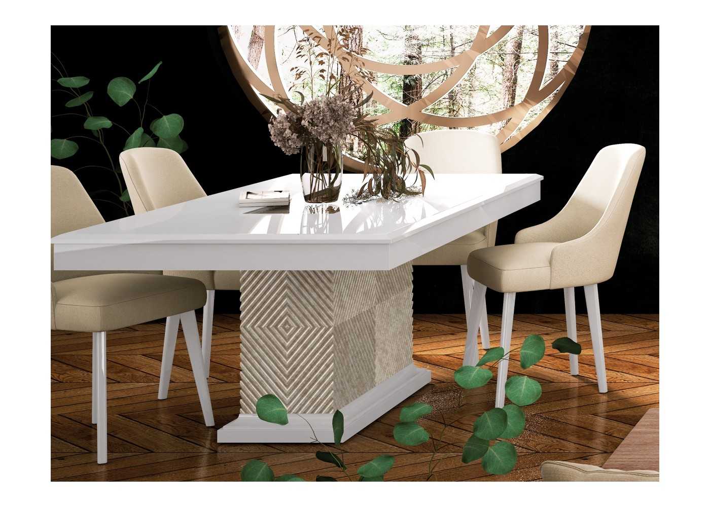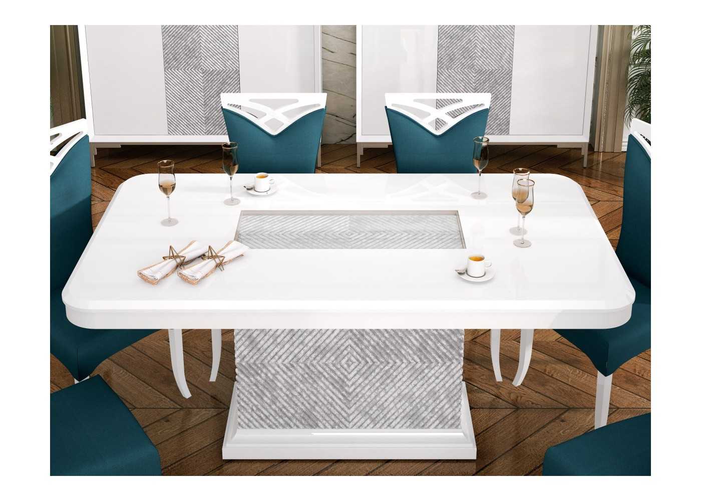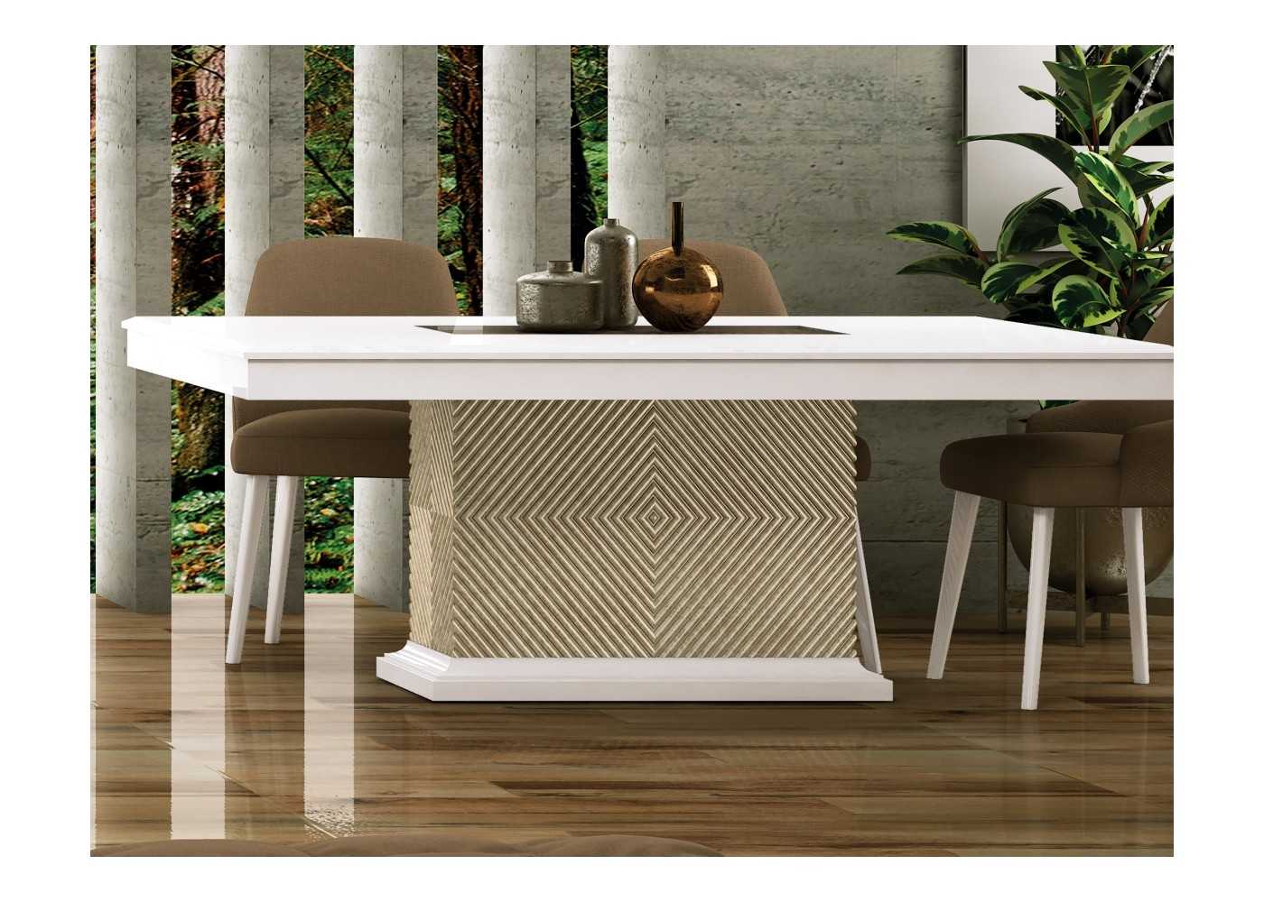 Espectacular mesa de comedor rectangular con cantos redondeados y tapa fija lacada con una original base columna con original grabado rombos en acabado marmolizado lacado.