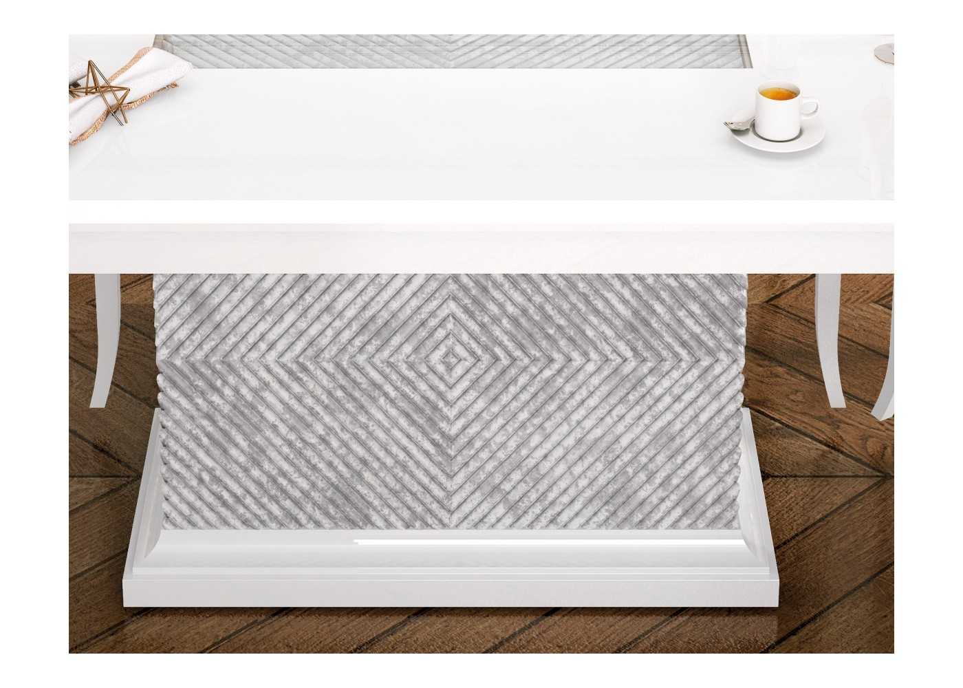Tapa de mesa con detalle central de cristal templado con interior decorado con grabados en forma de rombos y acabados en marmolizado champagne o plata a juego con la columna central.