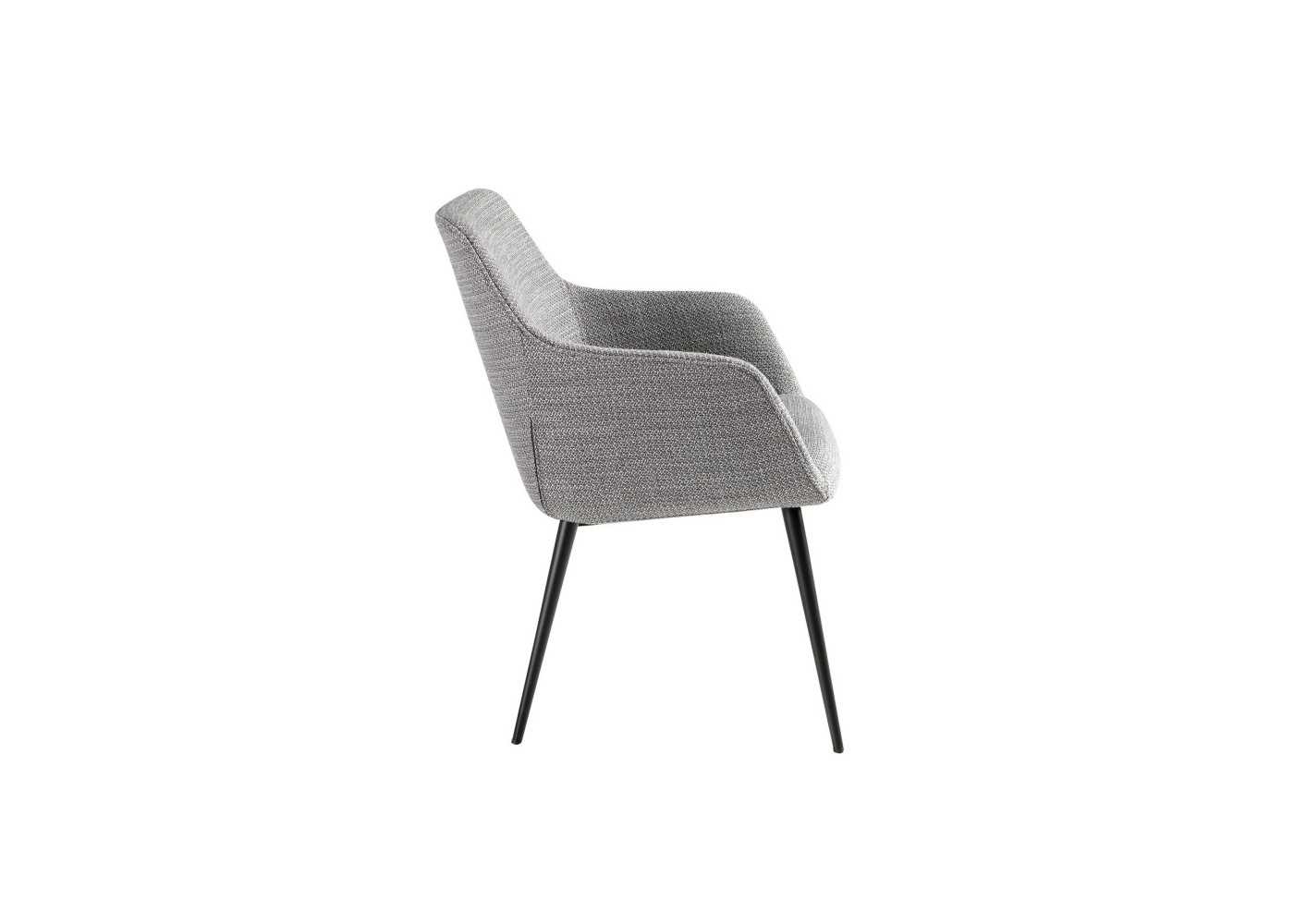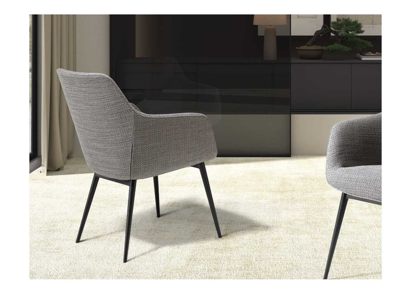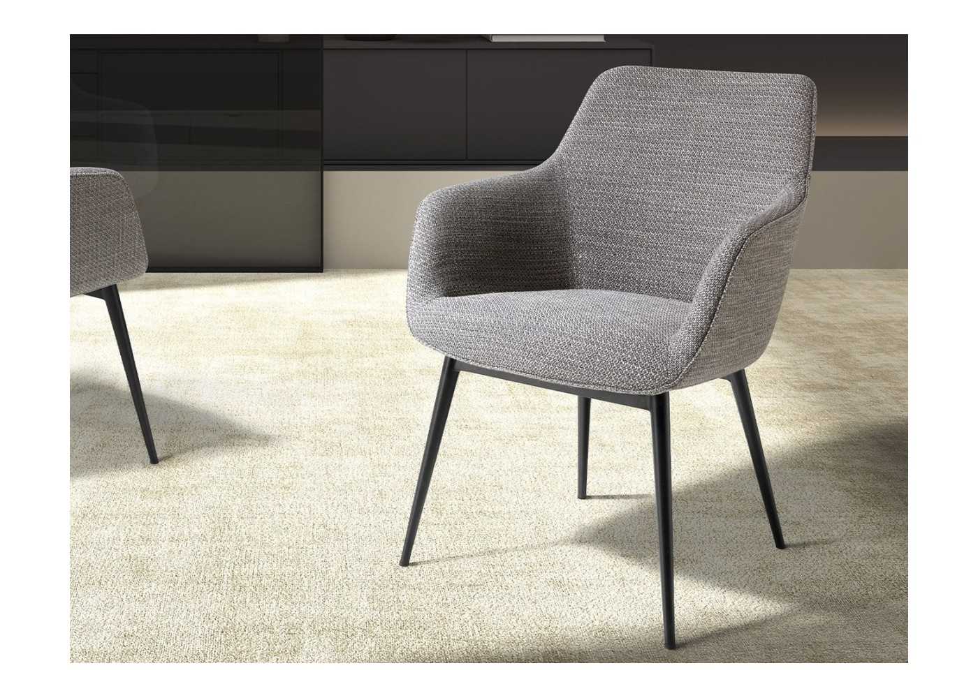 Silla con reposabrazos de diseño contemporáneo con asiento y respaldo tapizado en tela color gris y originales patas de acero inoxidable negro epoxi.