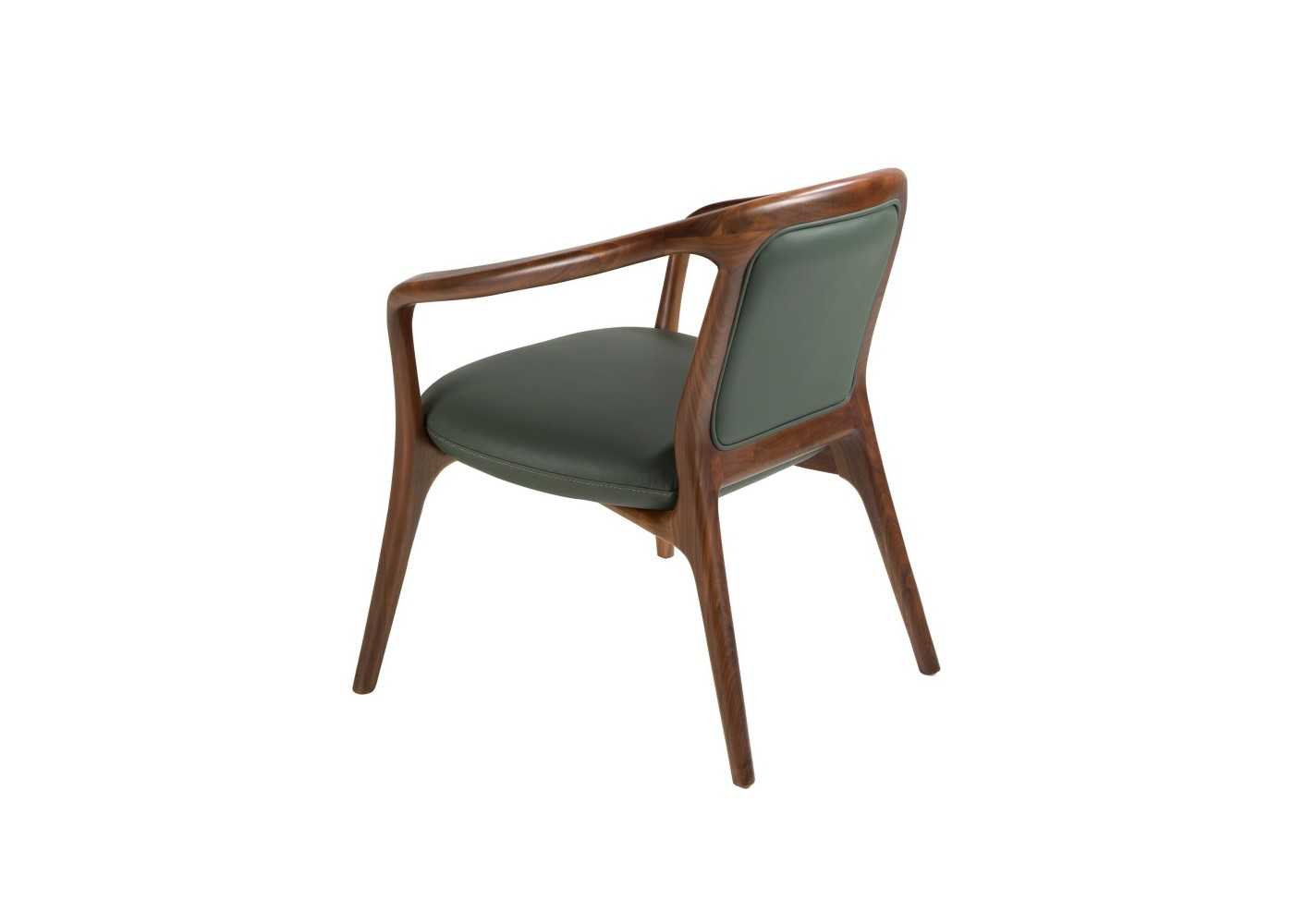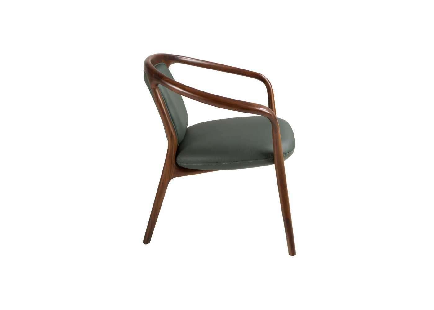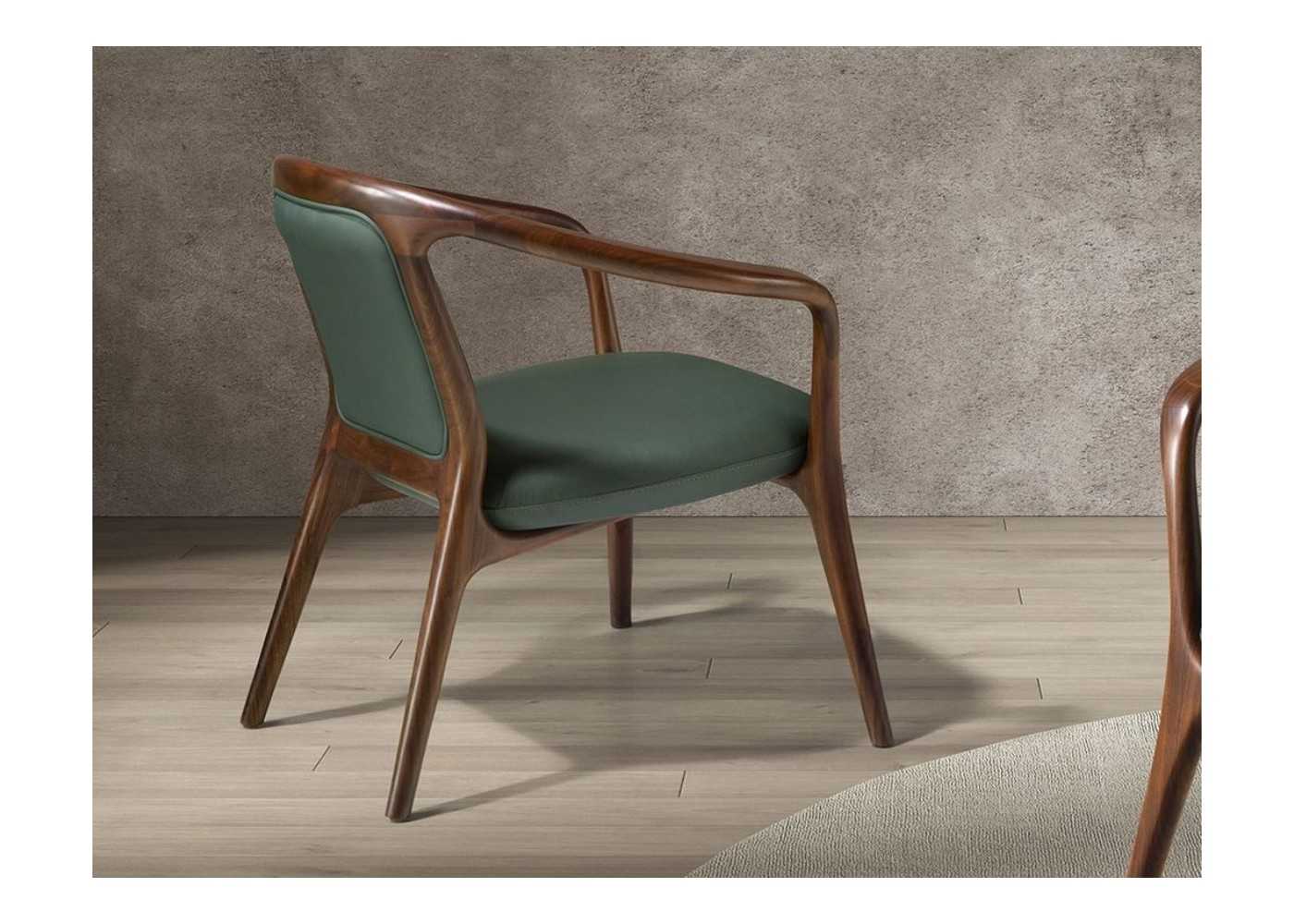 Confortable silla de diseño moderno con reposabrazos tapizada en piel sintética color verde oscuro y estructura , brazos y patas de madera maciza de fresno chapada en nogal.