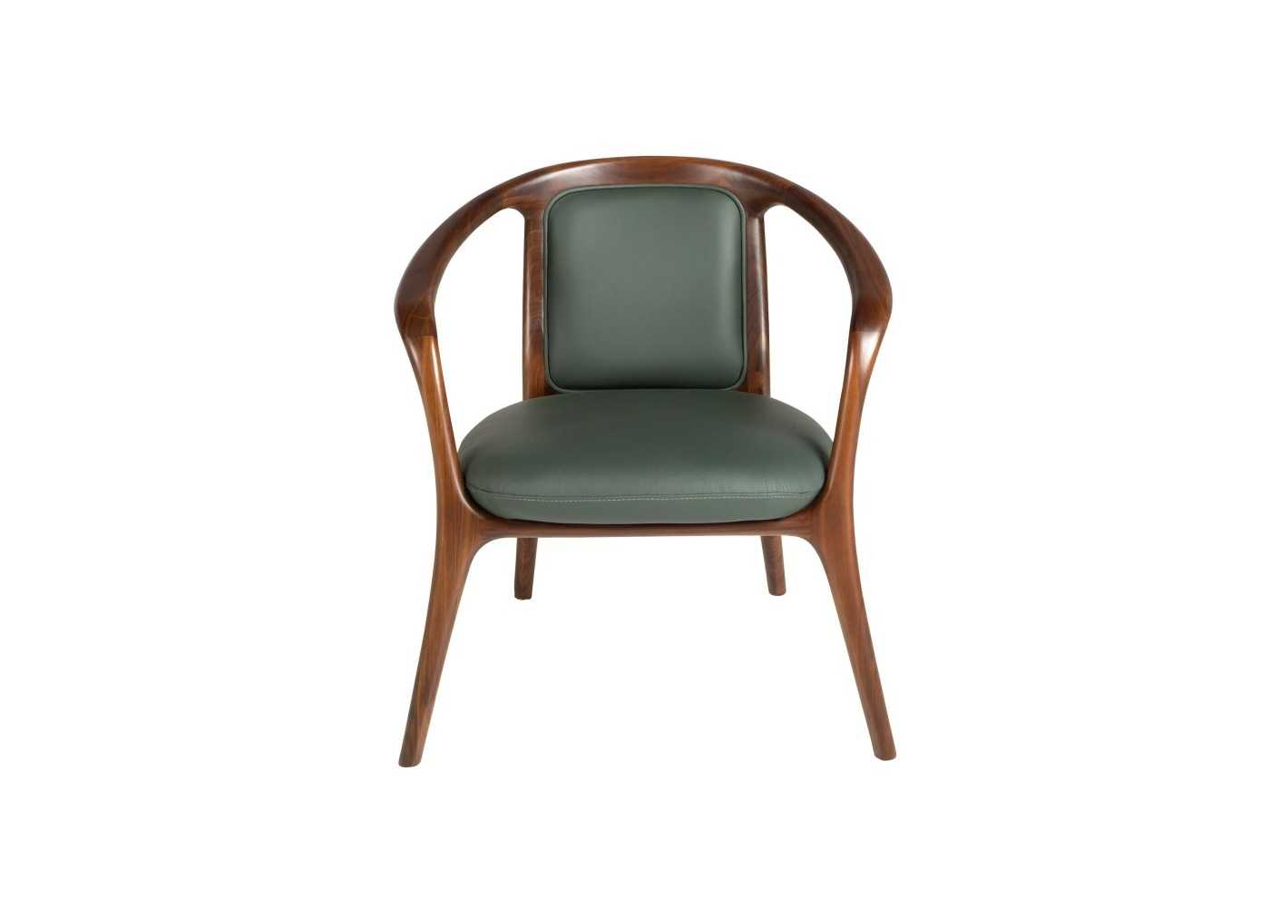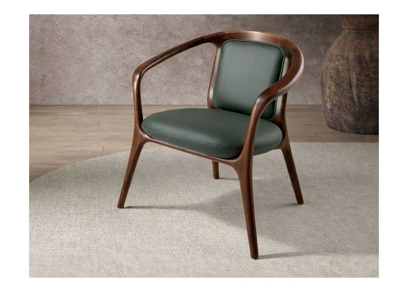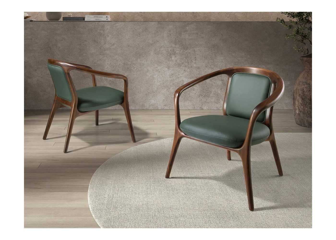 Confortable silla de diseño moderno con reposabrazos tapizada en piel sintética color verde oscuro y estructura , brazos y patas de madera maciza de fresno chapada en nogal.