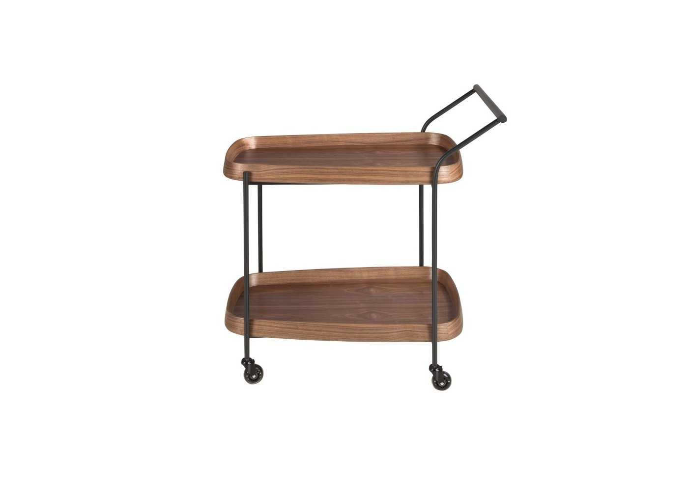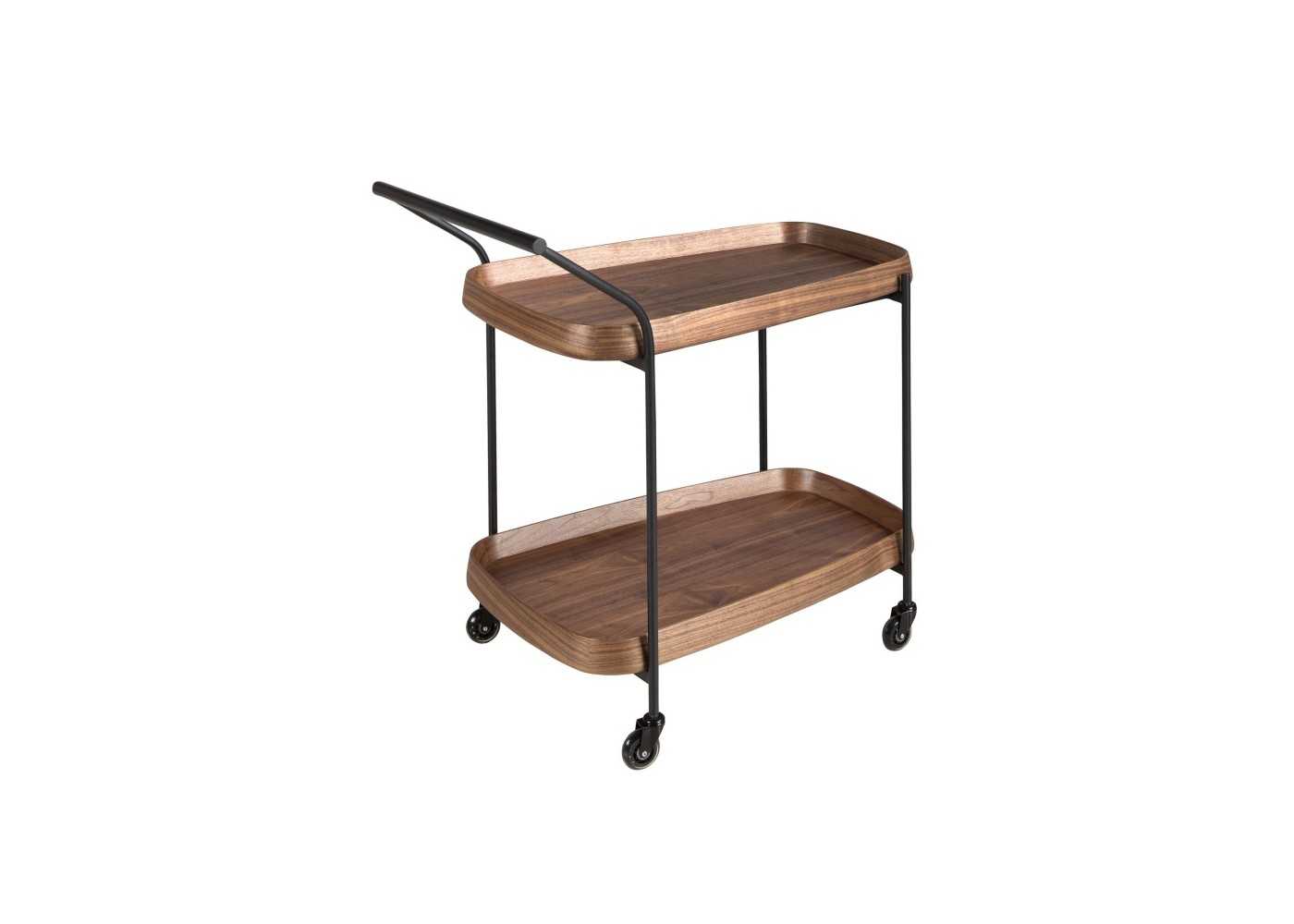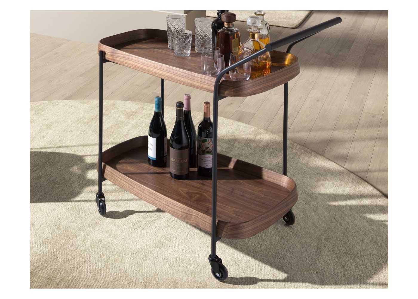 Carrito minibar de diseño moderno con estructura de acero inoxidable negro epoxi y bandejas de madera maciza de fresno chapas en nogal. Ruedas de PVC.