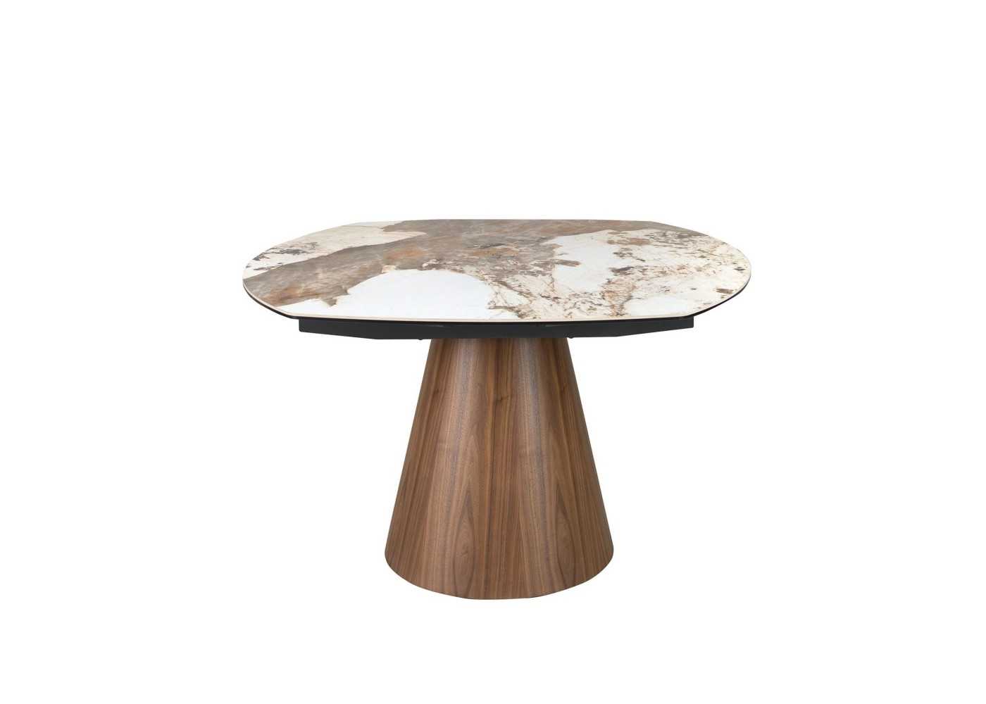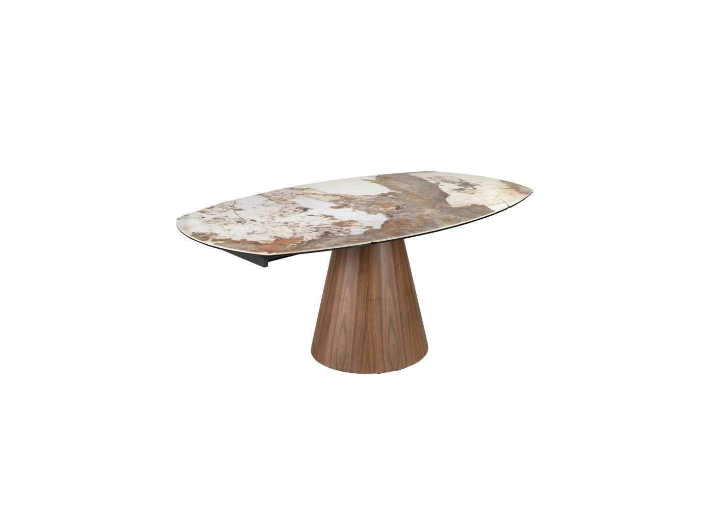 Mesa de comedor extensible con tapa ovalada barril de mármol porcelánico blanco brillo con vetas en tonos tierra y base cónica de madera de fresno chapada en nogal.
