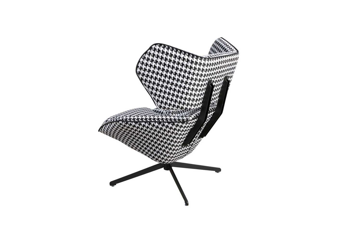 Sillón giratorio de diseño moderno tapizado en tela blanca y negra ( pata de gallo) con estructura y patas de acero inoxidable negro epoxi.