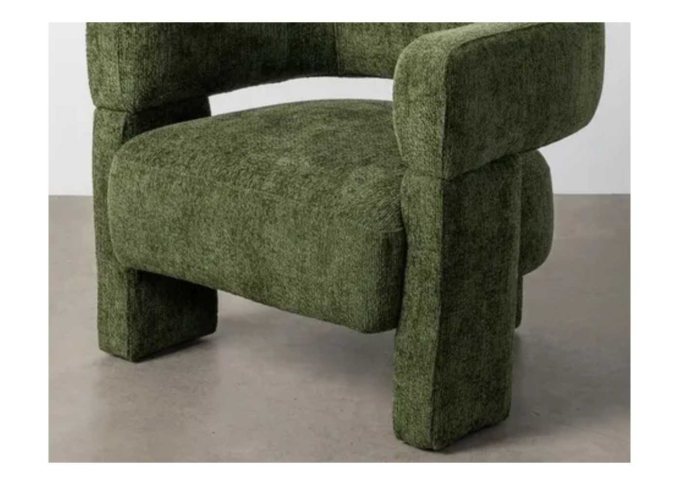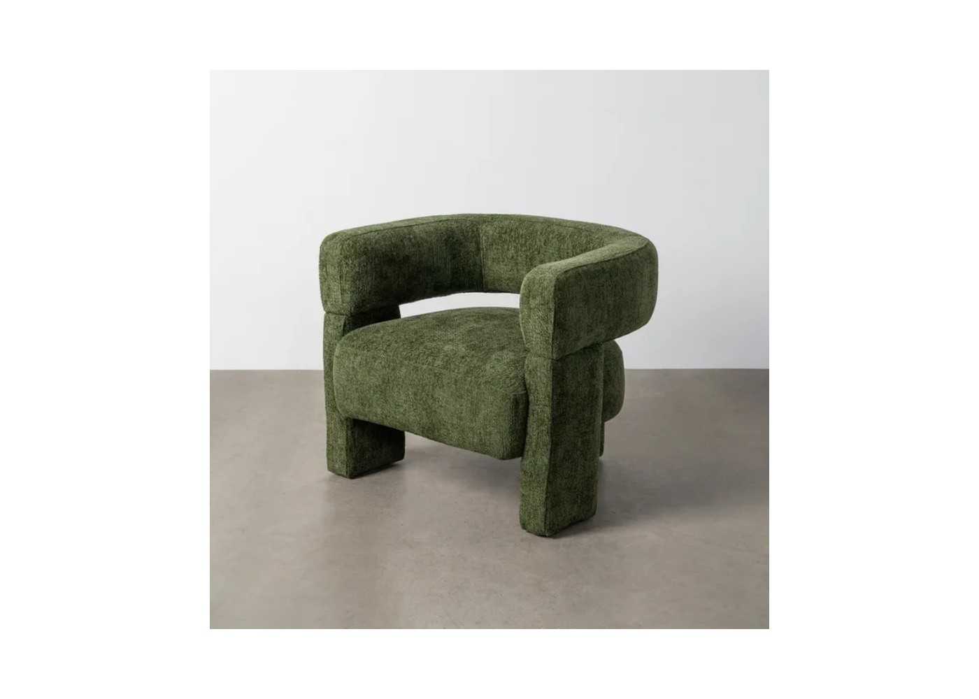 Sillón totalmente tapiado en tela aterciopelada color verde de diseño moderno.
