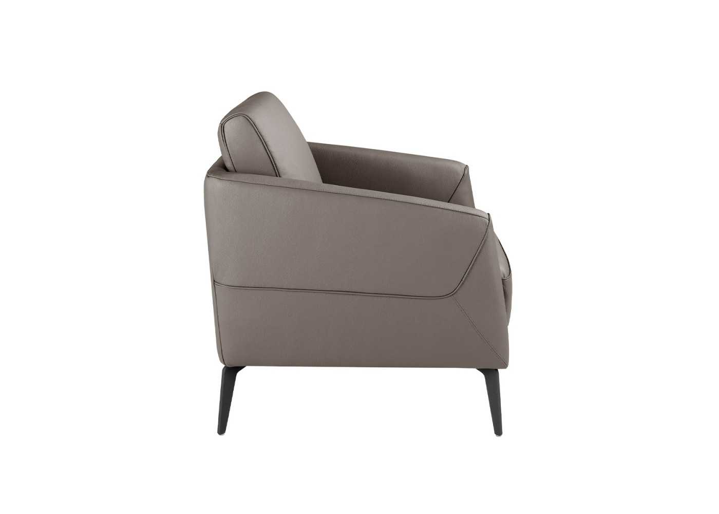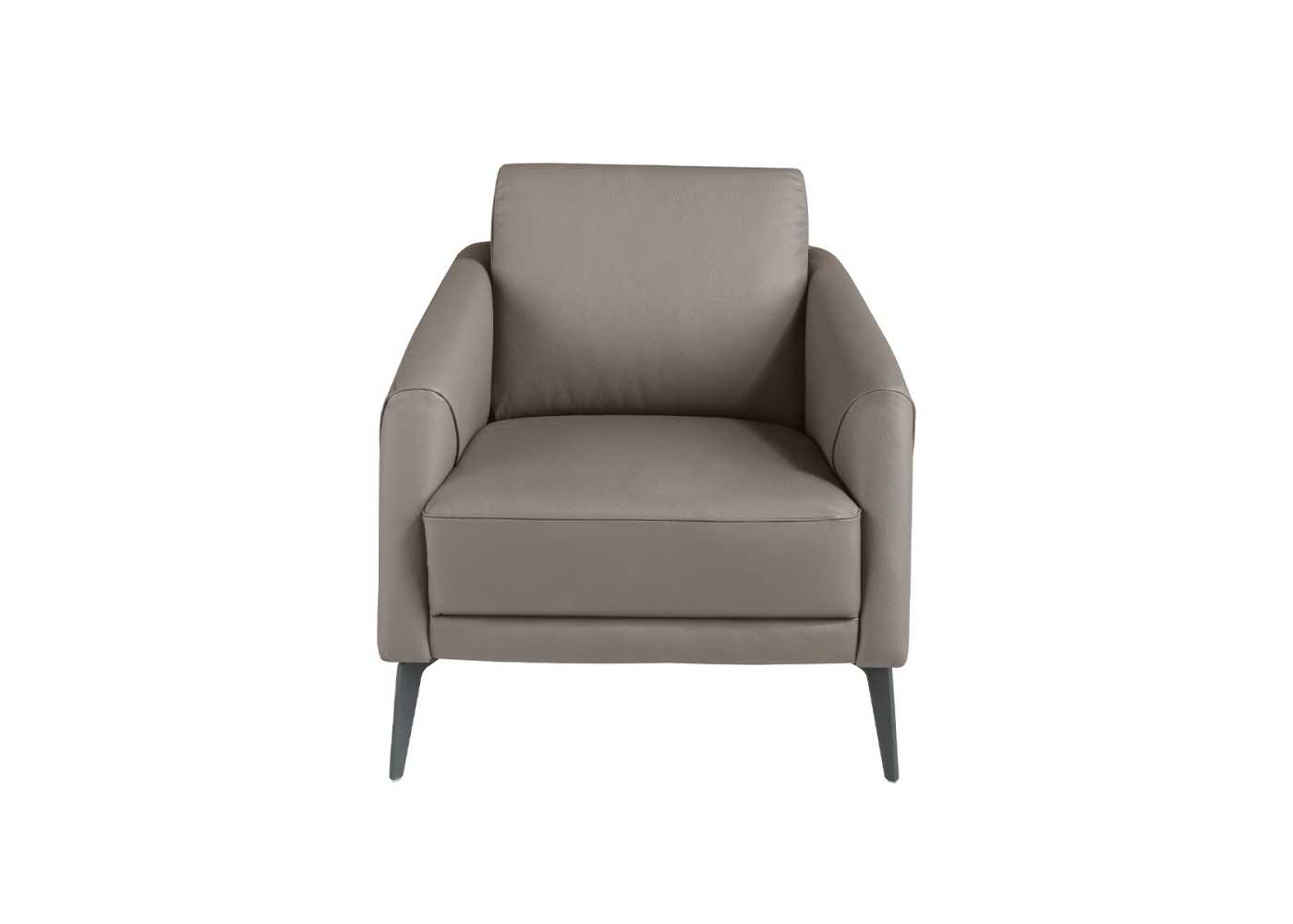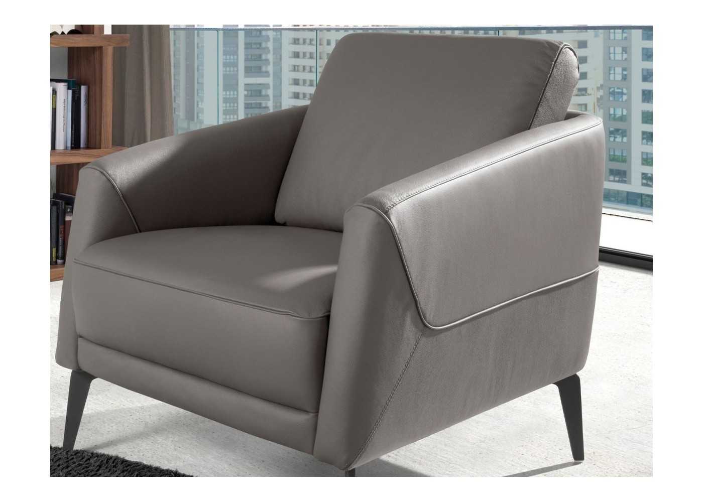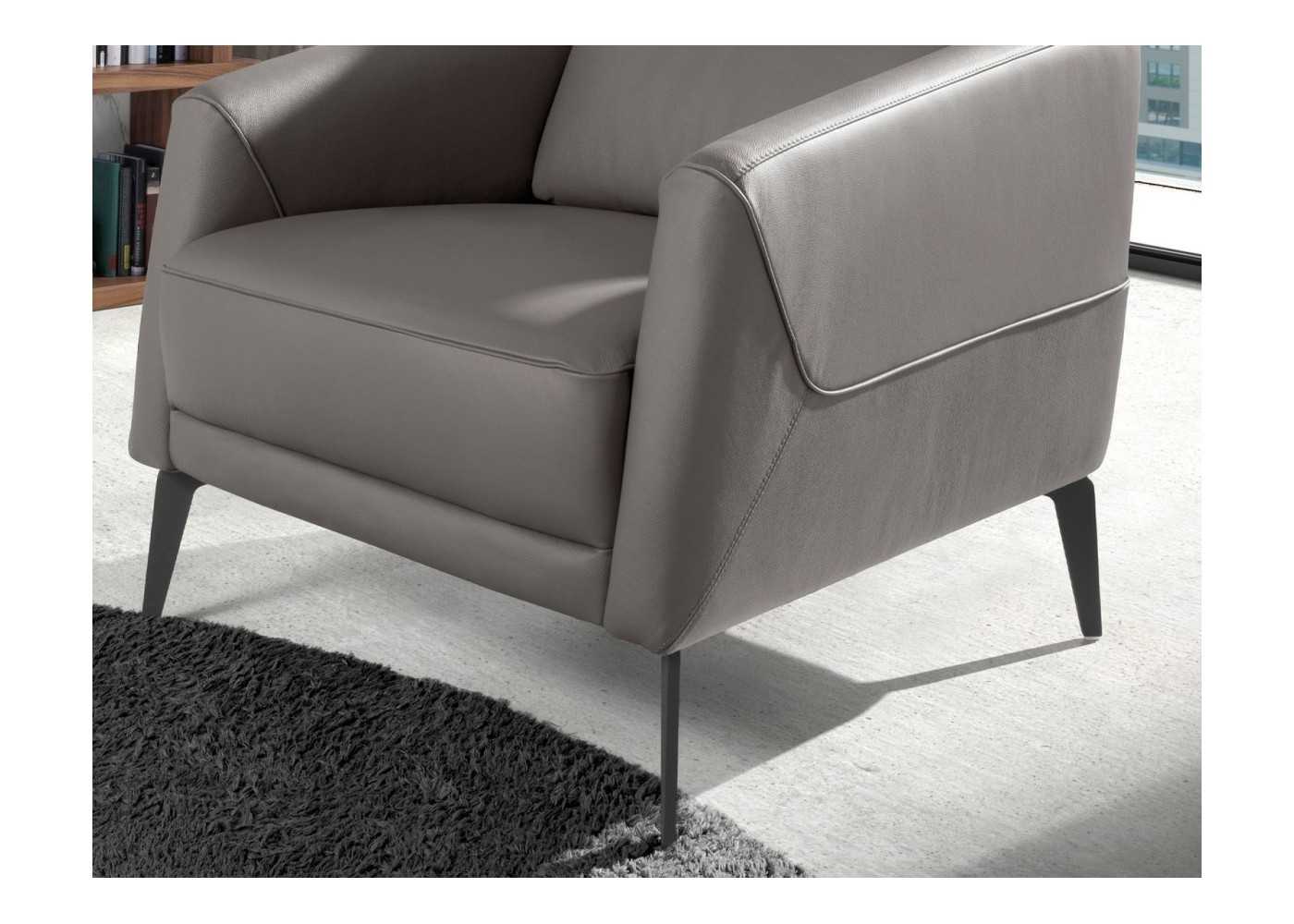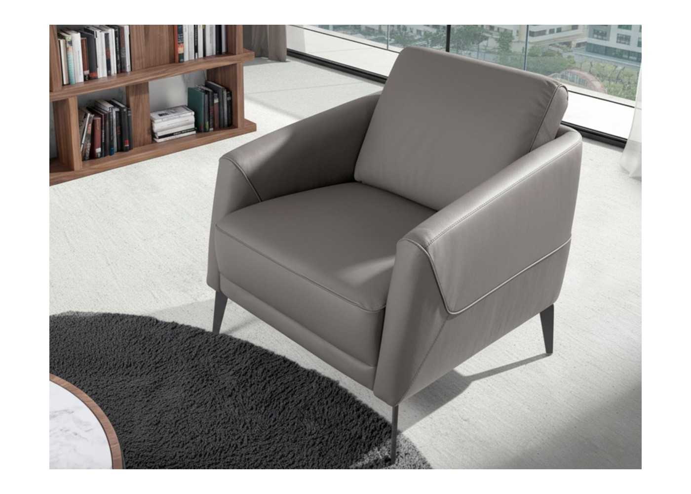 Sillón con reposabrazos de diseño moderno tapizado en piel genuina en color gris oscuro con patas en acero inoxidable color negro epoxi