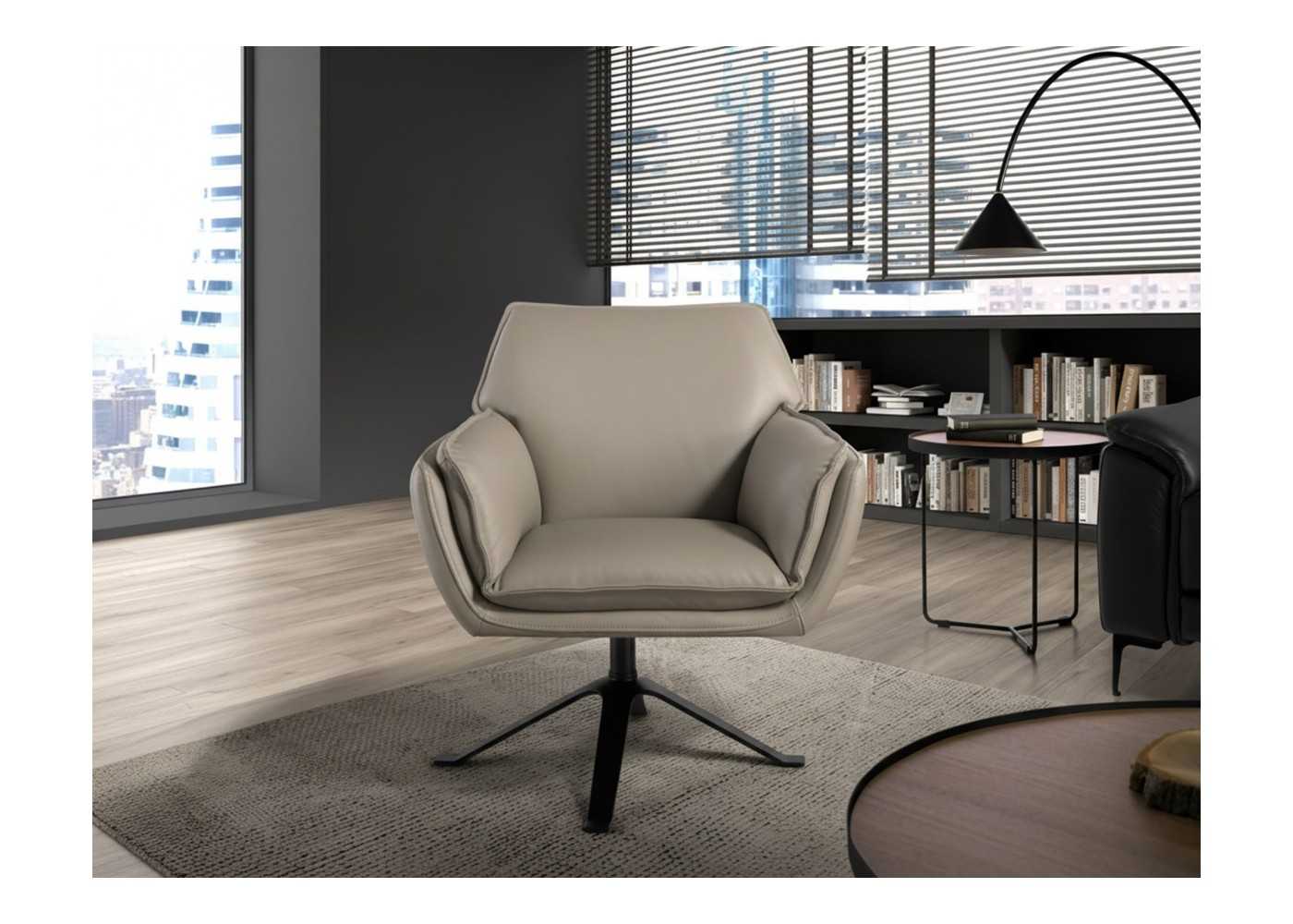 Sillón de diseño giratorio tapizado en piel genuina en color gris oscuro patas en acero inoxidable color negro.