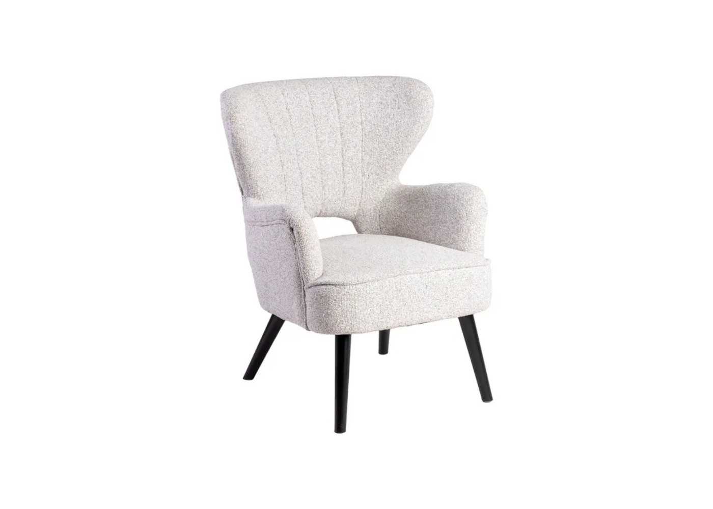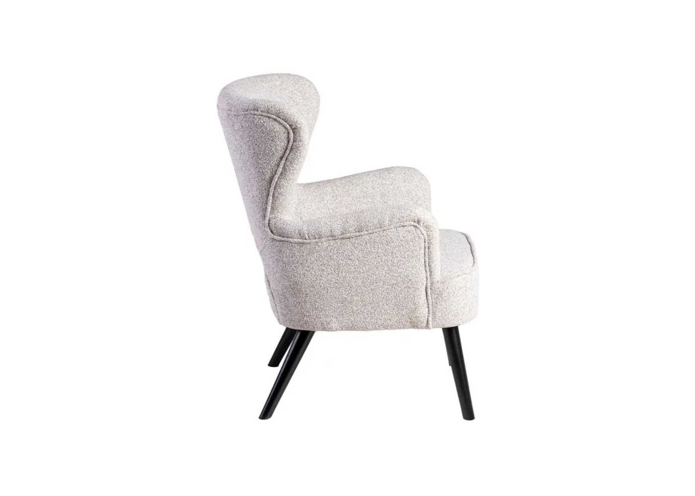 Confortable y decorativa butaca orejera de diseño atemporal tapizada en tela jaspeada en tono crudo con patas de madera maciza de pino lacada en color negro.