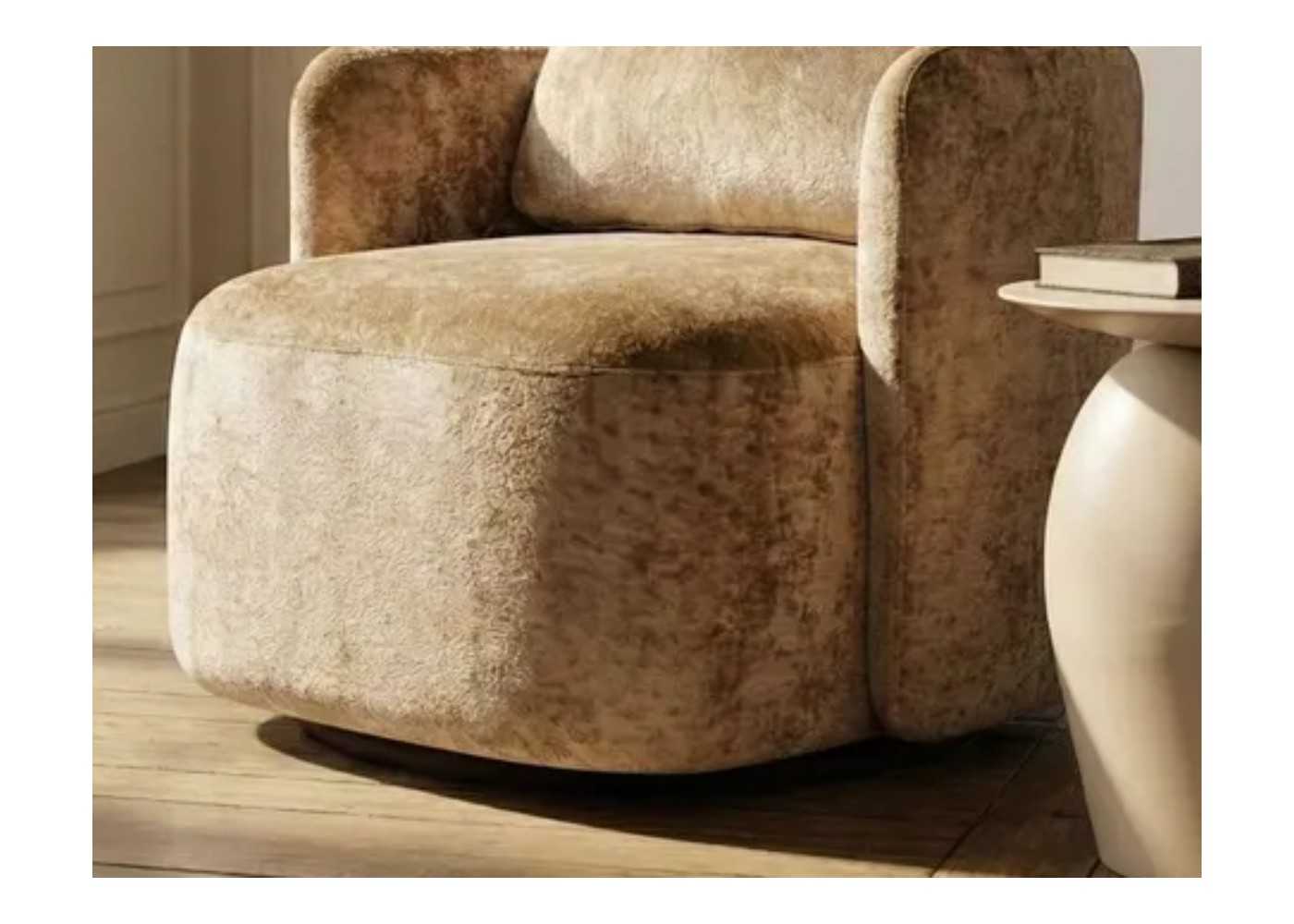 Elegante sillón giratorio de diseño moderno tapizado en terciopelo color beige.