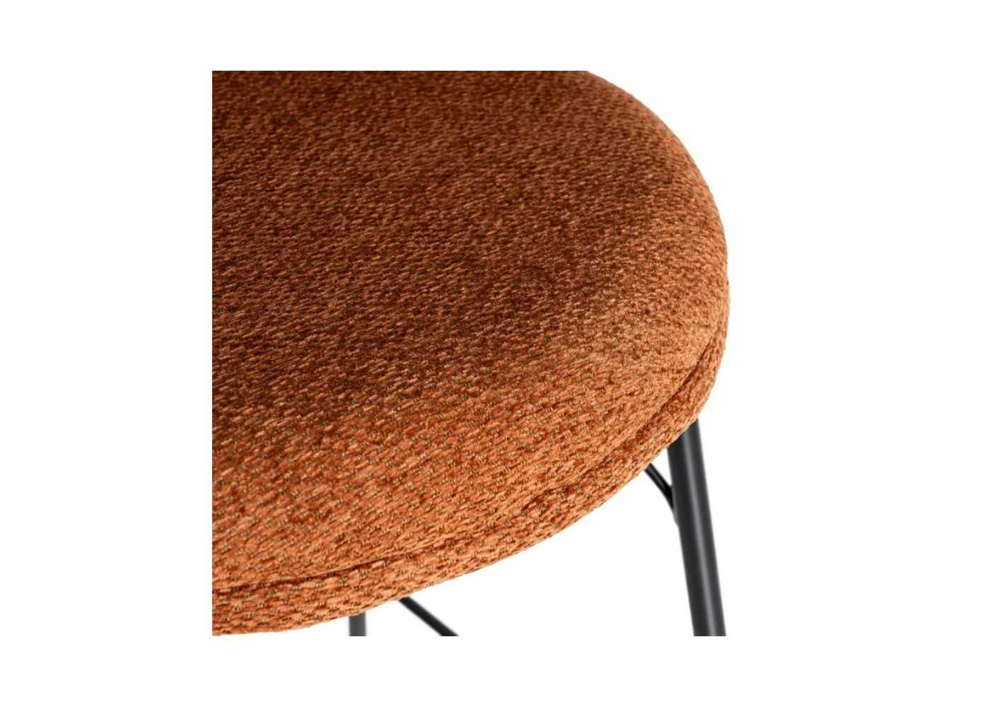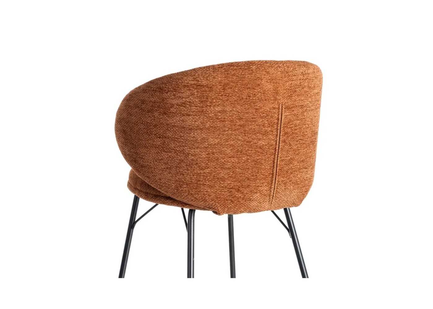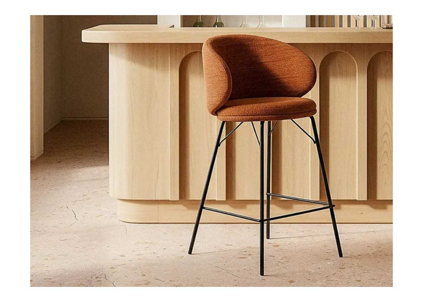 Taburete de diseño moderno con respaldo envolvente con brazos tapizada en tela color TERRACOTA con estructura de patas en acero lacado negro.