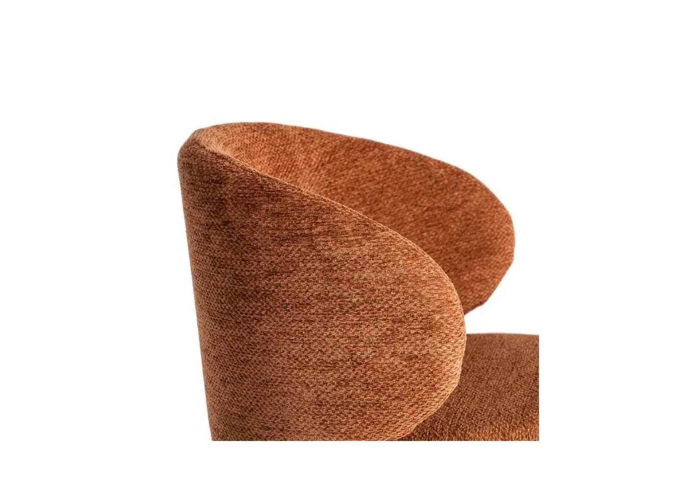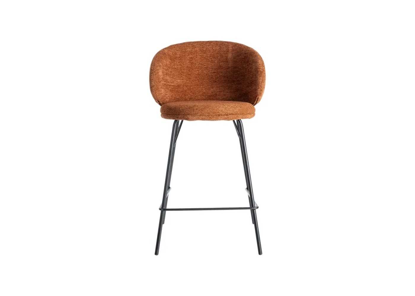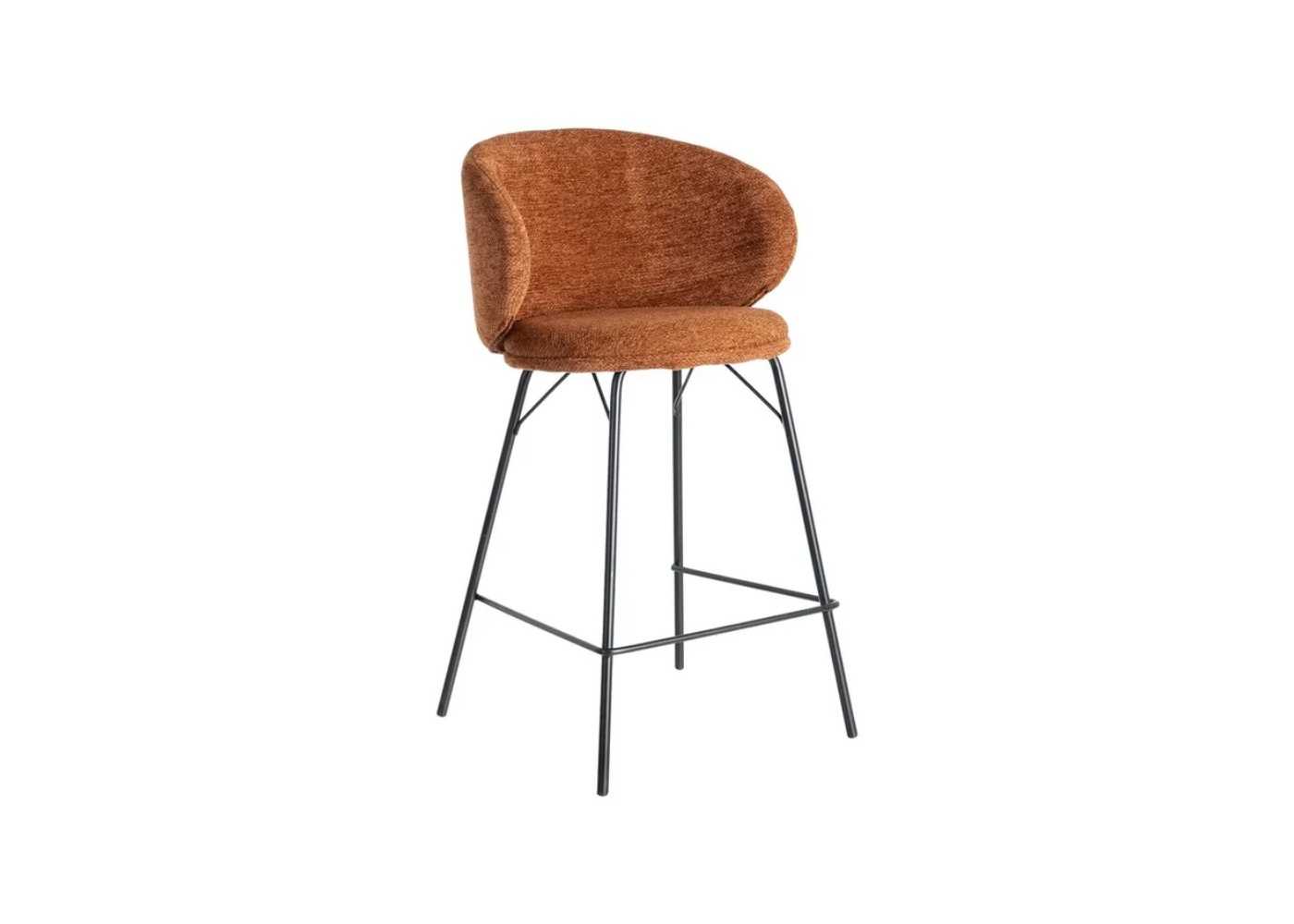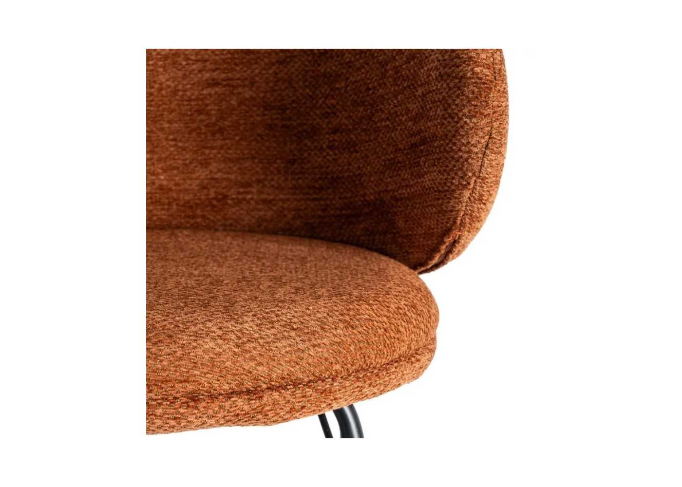 Taburete de diseño moderno con respaldo envolvente con brazos tapizada en tela color TERRACOTA con estructura de patas en acero lacado negro.
