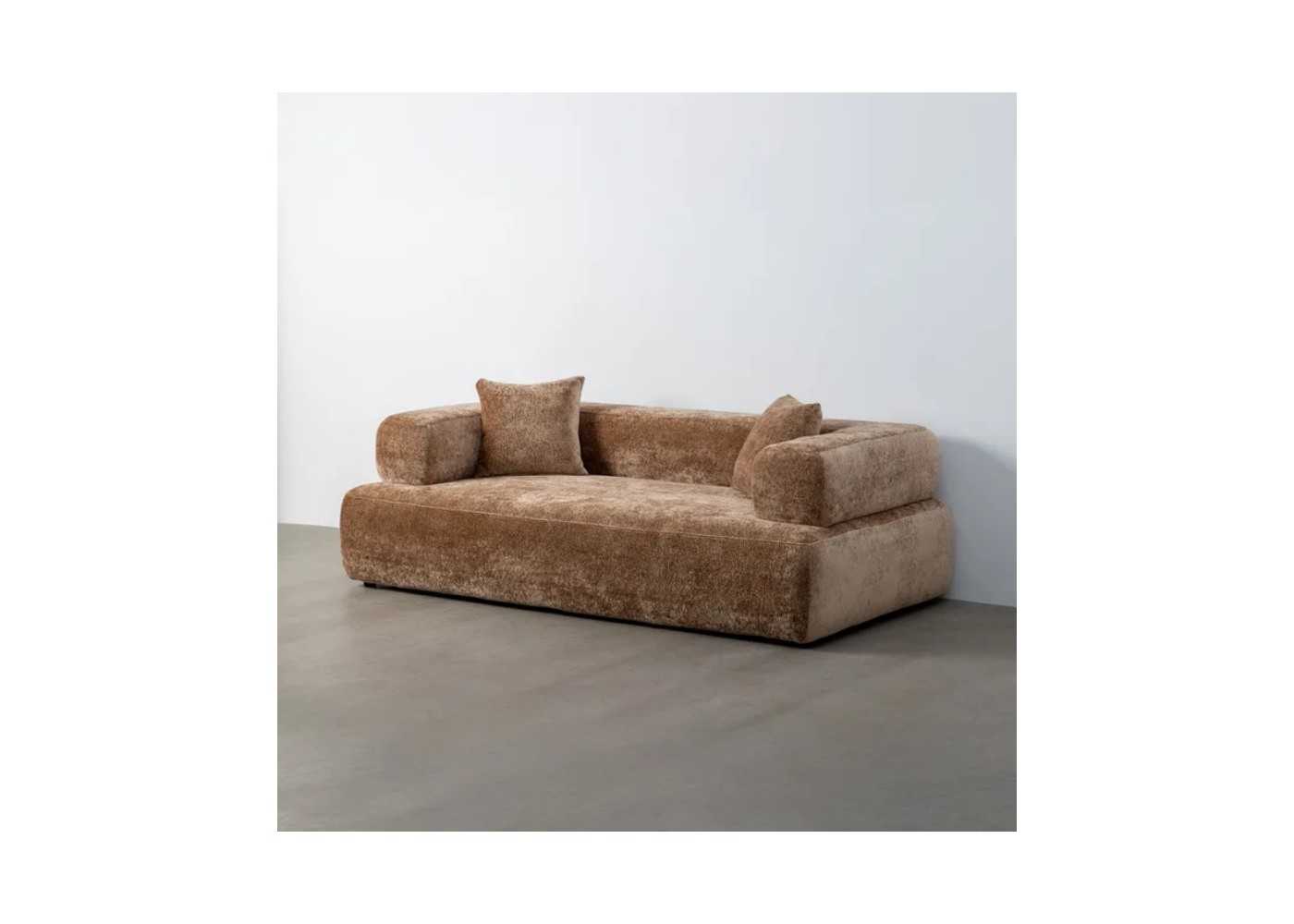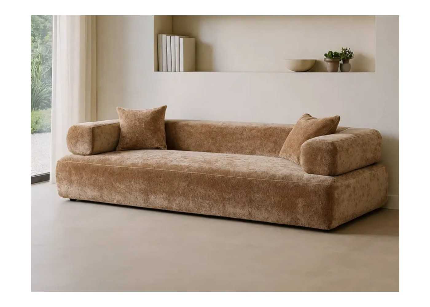 Confortable sofá de diseño moderno tapizado en terciopelo color beige oscuro.